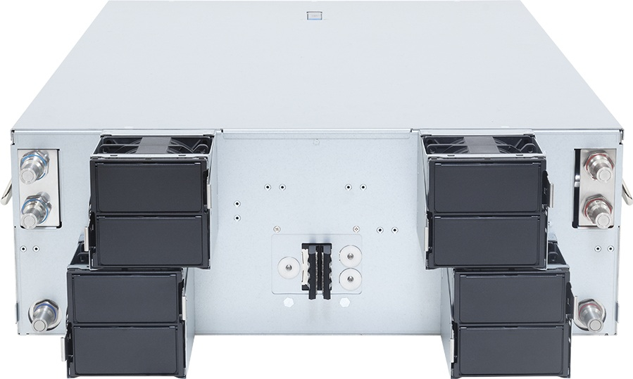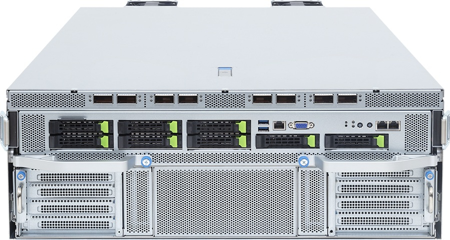 Сервер оборудован четырьмя слотами PCIe 5.0 x16 для карт расширения формата FHHL. Говорится о совместимости с DPU NVIDIA BlueField-3. Могут быть реализованы восемь OSFP-портов InfiniBand XDR с пропускной способностью до 800 Гбит/с или сдвоенные 400GbE-порты на базе NVIDIA ConnectX-8 SuperNIC. Кроме того, есть два сетевых порта 10GbE на основе контроллера Intel X710-AT2. Интерфейсные разъёмы, включая гнёзда RJ45 для сетевых кабелей и порты USB Type-A, сосредоточены во фронтальной части.