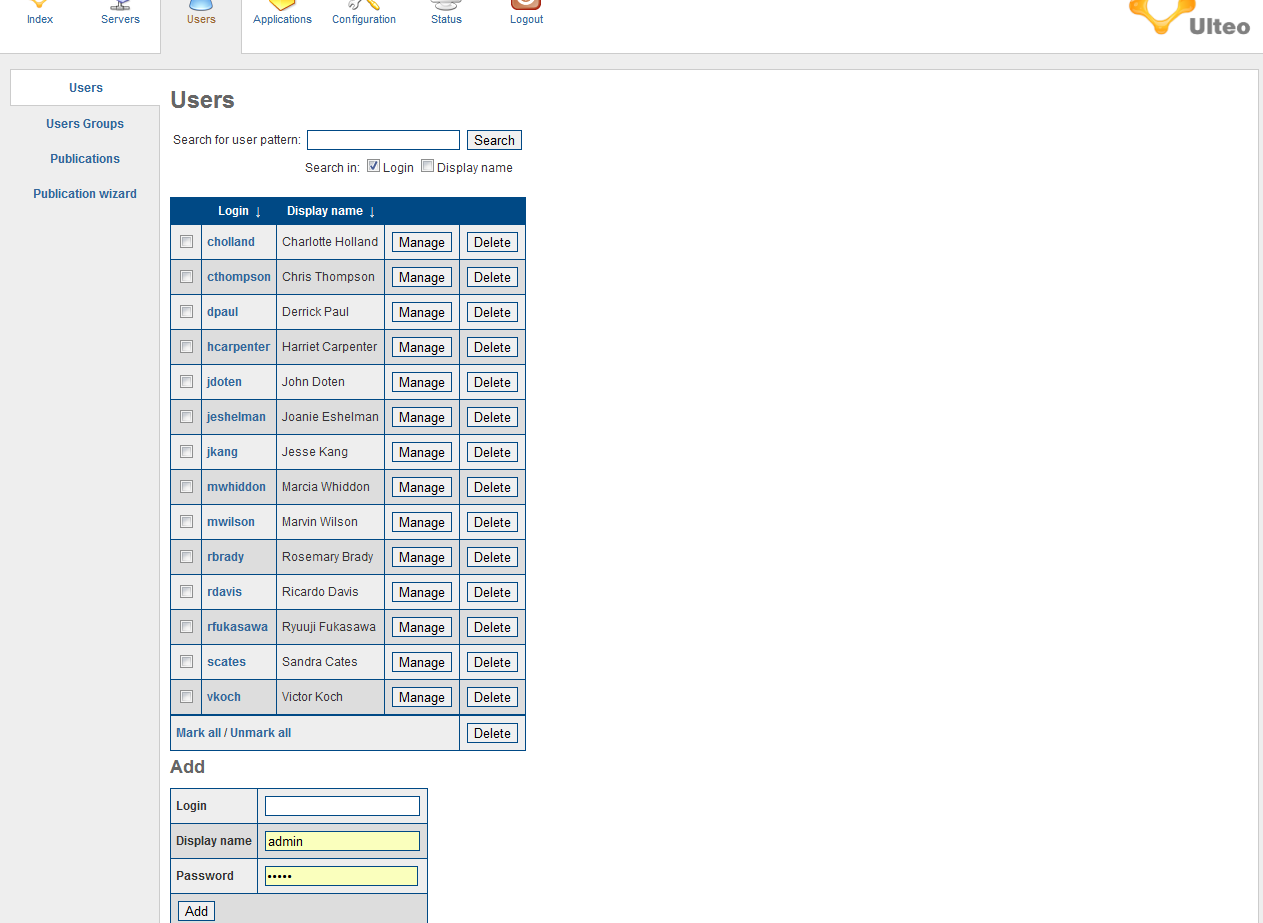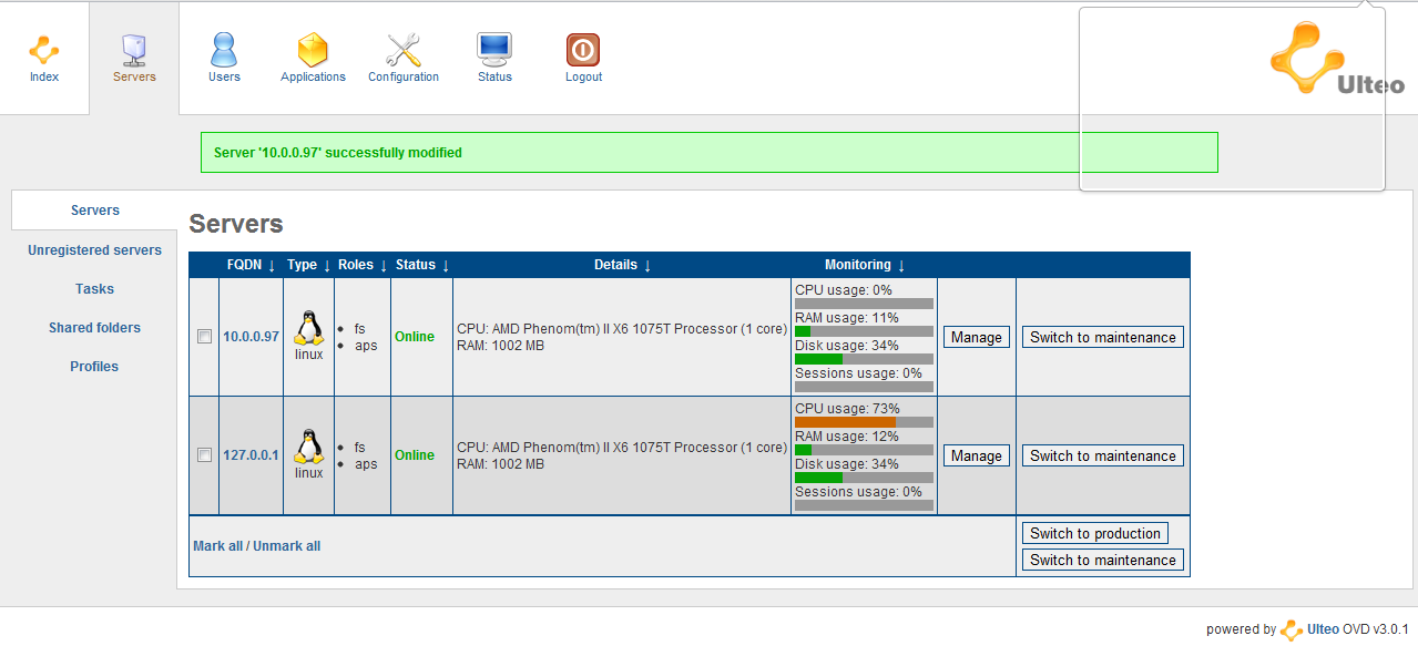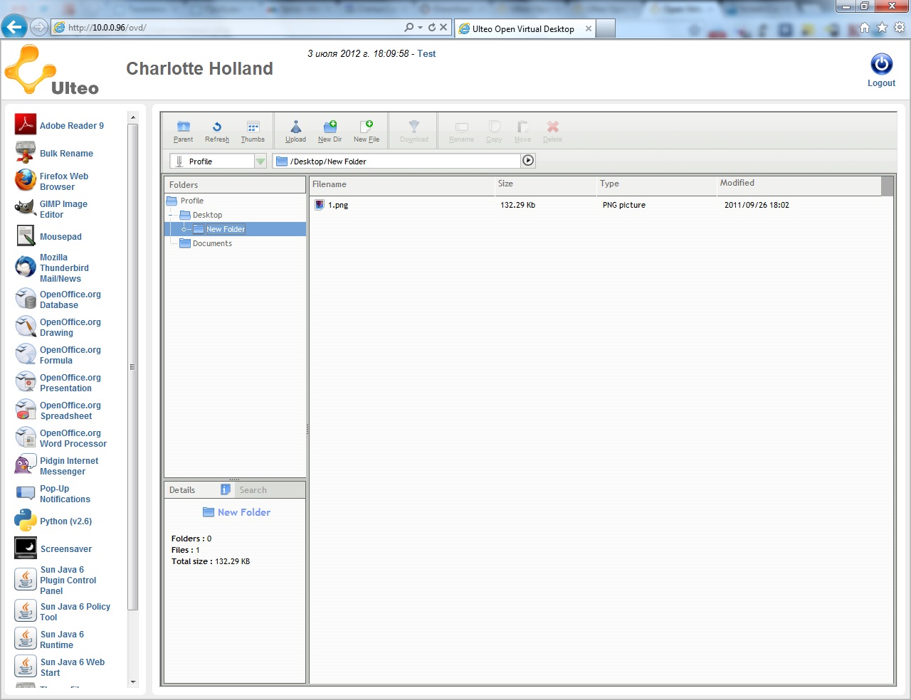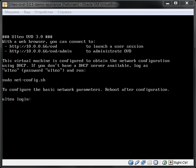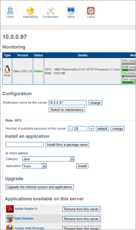 Для тестирования можно воспользоваться готовыми образами виртуальных машин. На пробу поднимем два виртуальных хоста: один оставим без изменений, на втором можно удалить менеджер сессий ( ulteo-ovd-session-manager) и переконфигурировать OVD ( dpkg-reconfigure ulteo-ovd-subsystem) с указанием адреса мастер-машины с менеджером. Управление OVD происходит через веб-интерфейс по адресу http://IP-адрес-сервера/ovd/admin/. Логин-пароль по умолчанию для веб-интерфейса admin, для консоли — ulteo.