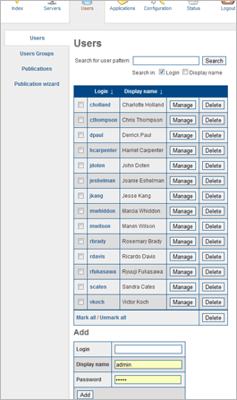Теперь можно управлять приложениями — устанавливать их или удалять из готового списка ПО, инсталлировать по имени пакета, вручную прописывать ссылки на любые другие утилиты и так далее. Не забудьте после установки «опубликовать» приложение, то есть добавить в одну или несколько групп и связать группы программ с группами пользователей. Для аутентификации пользователей используется либо внутренняя база, либо серверы LDAP/AD или CAS. Имеется возможность в один клик завести готовый набор учетных записей для тестовых целей.