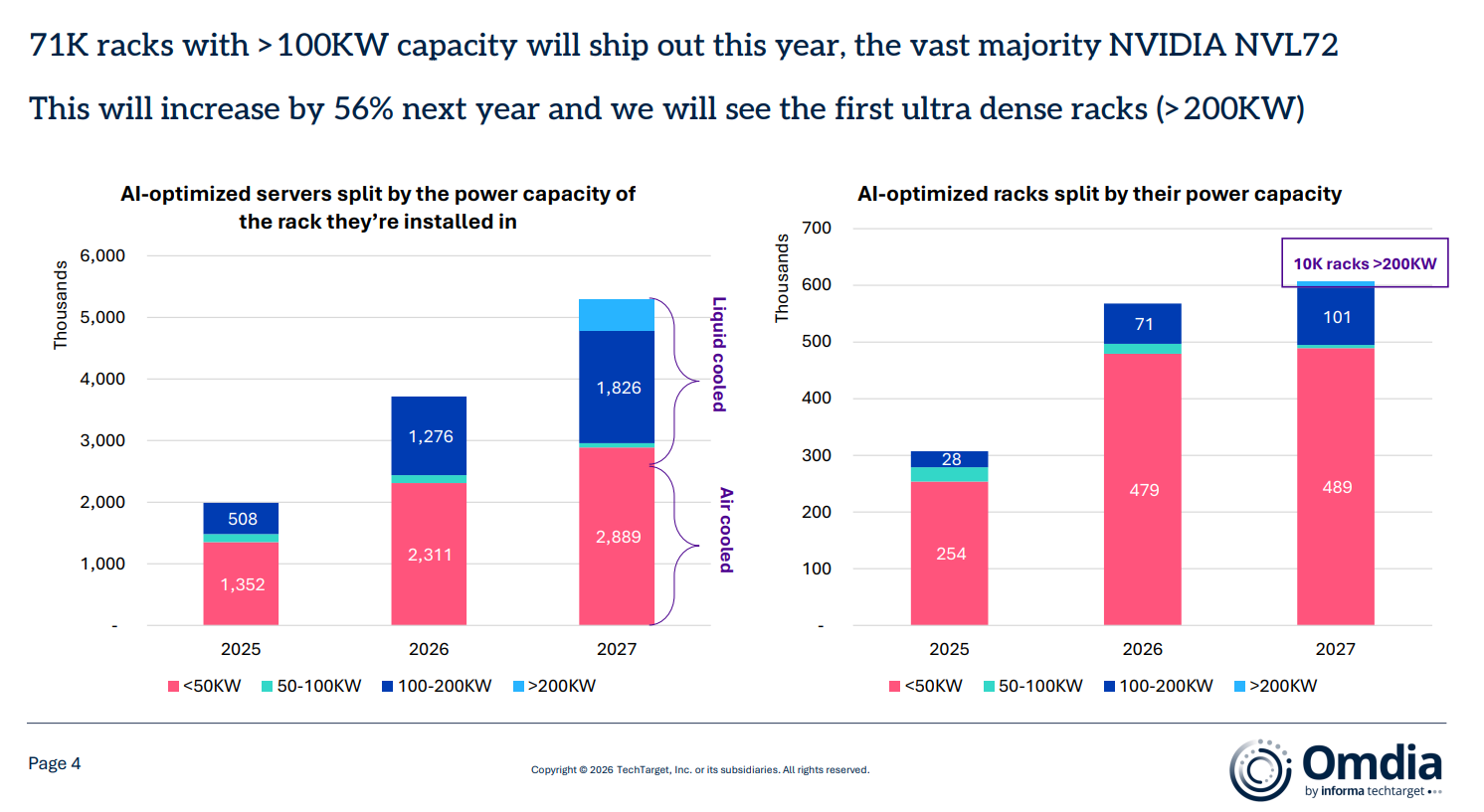 Источник изображения: Intel Как считает Omdia, в результате цены на серверные процессоры, возможно, вырастут на 10–15 % из-за дефицита предложения. Стоит учесть, что крупнейшие клиенты имеют долгосрочные соглашения с производителями с фиксированными ценами, иначе прогнозы были бы ещё хуже. Вместе с тем акции AMD и Intel упали из-за слабого, по мнению инвесторов, прогноза. Любые проблемы с CPU усугубят непростую ситуацию в цепочке поставок IT-оборудования. На фоне дефицита цены на DRAM-модули в данном квартале, вероятно, почти удвоятся, а цены на память NAND вырастут более чем на 30 %. Обычная DRAM оказалась в дефиците не в последнюю очередь потому, что производители перепрофилировали свои мощности на выпуск высокорентабельных продуктов — HBM-модулей для ИИ-ускорителей. Omdia обеспокоена тем, что дефицит оперативной памяти может сказаться на темпах производства серверов, что способно повлиять на сроки завершения уже реализуемых проектов ЦОД. Тем не менее, эксперты прогнозируют рост поставок серверов в 2026 году на 12 %. Основным драйвером выступает «цикл обновления» — необходимость закупки новых серверов общего назначения, что будет способствовать увеличению их поставок. При этом дефицит памяти называется большей угрозой, чем нехватка процессоров. Что касается стоек с серверами на базе ИИ-ускорителей, Omdia предполагает, что в 2026 году будет поставлено не менее 71 тыс. единиц с IT-нагрузкой более 100 кВт, в основном на базе систем NVIDIA NVL72. Благодаря высокому спросу на ИИ-инфраструктуру, Omdia ожидает, что в следующем году спрос увеличится ещё на 56 %, появятся и первые «сверхплотные» стойки мощностью более 200 кВт и дело на этом, вероятно, не закончится.