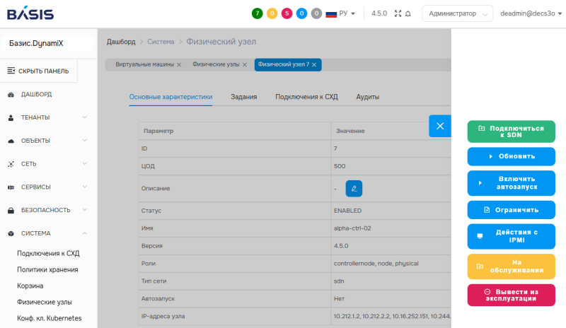 «Базис» представляет Basis Dynamix Enterprise с расширенной поддержкой отечественных СХД и новыми возможностями SDNКомпания «Базис», лидер российского рынка ПО управления динамической инфраструктурой, объявляет о выпуске версии 4.5 платформы серверной виртуализации Basis Dynamix Enterprise. Обновление расширяет возможности экосистемы «Базиса» за счёт более глубокой интеграции платформы с решением для управления программно-определяемыми сетями Basis SDN, улучшает совместимость Basis Dynamix Enterprise с отечественными системами хранения данных, а также предлагает ряд инструментов для повышения производительности и автоматизации управления динамической ИТ-инфраструктурой. Всего релиз 4.5 включает более 90 улучшений и дополнений, направленных на расширение возможностей платформы и повышение удобства работы с ней. Расширение поддержки отечественных систем хранения данныхОдним из ключевых направлений развития Basis Dynamix версии 4.5.0 стало расширение совместимости с российскими СХД. Появилась поддержка СХД uStor, которая охватывает полный набор операций: создание и управление дисками, работу с образами и снапшотами, презентацию и депрезентацию дисков на вычислительные узлы. Помимо этого, платформа теперь поддерживает работу с СХД YADRO TATLIN.UNIFIED, версия ПО 3.2; обратная совместимость с предыдущими версиями прошивки Tatlin при этом сохранена. В результате заказчики получают большую свободу выбора оборудования при проектировании импортонезависимой инфраструктуры и дополнительный комфорт при работе с этим оборудованием средствами платформы. Эффективное использование дискового пространстваВ релизе 4.5 реализована поддержка unmap для дисков виртуальных машин. Теперь когда виртуальная машина удаляет файлы, освободившееся пространство не просто помечается как свободное внутри гостевой ОС, а возвращается обратно в систему хранения данных. Это позволяет более рационально использовать ёмкость СХД, что особенно актуально для организаций с большим парком виртуальных машин и при работе с тонкими (thin-provisioned) дисками. Развитие интеграции с программно-определяемыми сетямиВерсия 4.5 развивает нативную интеграцию платформы Basis Dynamix Enterprise с решением для организации программно-определяемых сетей Basis SDN и предлагает обновлённый набор сетевых функций. В частности, при создании виртуальных машин теперь можно автоматически подключать сетевые сегменты SDN с созданием логических портов — это упрощает сетевую настройку и сокращает количество ручных операций для администраторов. Автоматизация управления узламиBasis Dynamix 4.5 получила механизм автоматической смены статуса физического узла с «На обслуживании» на «Работает» — соответствующая настройка появилась на странице «Физические узлы» интерфейса платформы. Вместе с хостом автоматически запускаются размещённые на нём виртуальные машины, которые были привязаны к нему в момент получения хостом статуса «На обслуживании». Функция доступна как для отдельных узлов, так и для целых зон, что упрощает обслуживание крупных инсталляций. Другие улучшенияПомимо вышеперечисленного, в Basis Dynamix 4.5.0 реализован ряд небольших, но важных улучшений, которые повышают удобство администрирования платформы. Появился механизм Watchdog для автоматического восстановления зависших виртуальных машин, добавлена поддержка режима Cache Write Through для повышения п