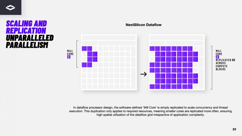 Переконфигурируемый ускоритель NextSilicon Maverick-2 с dataflow-архитектурой меняет подход к вычислениямВ конце октября стартап NextSilicon объявил о выходе Maverick-2 — интеллектуального ускорителя вычислений (Intelligent Compute Accelerator, ICA), анонсированного в прошлом году. Чип уже используется в Сандийских национальных лабораториях (SNL) Министерства энергетики США (DOE) в составе суперкомпьютера Vanguard-II, а также рядом клиентов. Как утверждает глава NextSilicon Элад Раз (Elad Raz), компании в сфере научных вычислений и HPC сталкиваются с проблемой ограниченных возможностей CPU и GPU, из-за чего приходится идти на компромиссы, но архитектура Maverick решает эту проблему. По словам NextSilicon, нынешние массовые CPU «скованы» архитектурой фон Неймана 80-летней давности, в которой значительная часть отведена вспомогательной логике, включая предсказание ветвлений, внеочередное исполнение и т.д., а не собственно исполнительным устройствам. В свою очередь, GPU обеспечивают более высокую параллельную производительность, но для эффективного использования ускорителей требуются специализированные среды разработки (CUDA), управление сложными иерархиями памяти, когерентностью кешей и т.п. А ASIC, созданные для конкретных ИИ-задач, обеспечивают высокую производительность и эффективность, но их разработка требует больших затрат. NextSilicon предлагает заменить эти решения чипом с управлением потоками данных (dataflow), который можно перенастраивать во время выполнения задач для устранения узких мест кода, и у которого нет ограничений, присущих CPU и GPU. «В ресурсоёмких приложениях большую часть времени выполняется лишь небольшая часть кода, — рассказал Раз. — Мы разработали интеллектуальный программный алгоритм, который непрерывно отслеживает работу приложения. Он точно определяет, какой путь кода выполняется чаще всего, и перенастраивает чип для ускорения именно этих путей. И всё это мы делаем во время исполнения кода и за наносекунды». FPGA тоже можно перепрограммировать, но для этого нужен цикл перезагрузки. Аппаратная часть Maverick представляет собой реконфигурируемую структуру ALU, которой отведена большая часть «кремния». которую можно быстро перенастраивать во время выполнения кода. Это означает больше вычислений за такт (и на Ватт), при условии, что данные находятся в нужном месте в нужное время. Алгоритм анализирует код на наличие узких мест и соответствующим образом настраивает чип во время выполнения программы. Программно-определяемая архитектура управления потоками данных позволяет достичь производительности и эффективности, близких к ASIC, не привязываясь к конкретному приложению и сохраняя гибкость алгоритмов, утверждает NextSilicon. В архитектуре NextSilicon вычислительные блоки (CB) подключены к шине памяти для получения данных, которые временно хранятся в станции резервирования (RS). Диспетчер определяет время запуска вычислительного блока. (RS и диспетчер аналогичны регистрам в процессоре.) Точки входа в память (MEP-блоки) обрабатывают операции доступа к памяти, генерируя запросы к шине, а по завершении направляют ответ в RS. MMU и TLB-кеш занимаются трансляцией адресов (при необходимости). Всё остальное пространство CB занято ALU, который в первом приближении и можно считать «инструкциями». Компания не уточняет, сколько именно CB содержится в чипе, но на фото кристалла их 224. Из ALU компилятор NextSilicon формируе