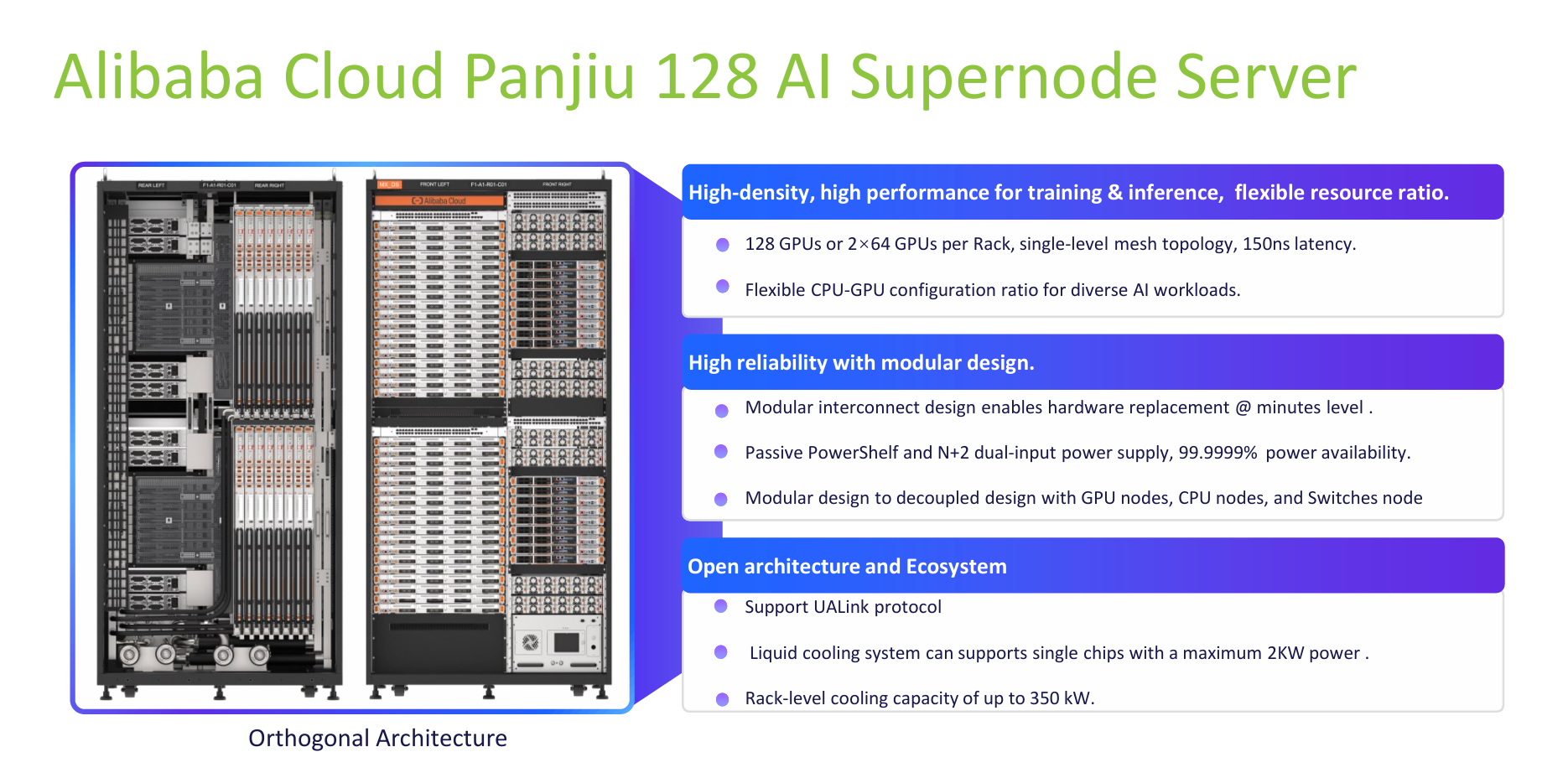 350-кВт ИИ-суперускоритель Alibaba Panjiu 128 Supernode объединяет 128 GPU мощностью до 2 кВтОблачная платформа Alibaba Cloud в ходе мероприятия 2025 OCP Global Summit анонсировала систему Panjiu 128 Supernode, предназначенную для решения наиболее ресурсоёмких задач в сфере ИИ. Новинка представляет собой стойку высокой плотности мощностью до 350 кВт. Решение имеет «ортогональную архитектуру» с возможностью размещения определённых компонентов перпендикулярно друг к другу. Говорится о поддержке до 128 ускорителей на базе GPU и о гибких возможностях в плане конфигурации CPU — GPU. Задействованы фирменные DPU-решения Cloud Infrastructure Processing Unit (CIPU) 2.0 и высокопроизводительные сетевые адаптеры. Кроме того, реализована поддержка протокола UALink, который разрабатывается в качестве альтернативы NVIDIA NVLink.