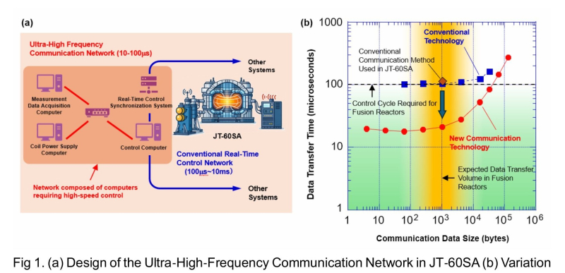 Японский токамак JT-60SA получил от NTT «суперсеть» для управления плазмойБазирующаяся в Тибе (Япония) организация National Institutes for Quantum Science and Technology (QST) и японская телекоммуникационная компания NTT сообщили о разработке технологии высокоскоростной высокочастотной связи в реальном времени, необходимой для управления плазмой в термоядерном реакторе и её поддержании в стабильном состоянии. Исследователи отметили, что для удержания плазмы высокого давления в термоядерной установке крайне важно контролировать быстро нарастающие плазменные неустойчивости в чрезвычайно короткие отрезки времени — менее чем 1/10 000 секунды (100 мкс). Увеличение размеров установок и возрастающая сложность управления требуют оперативной связи на больших расстояниях между компьютерами внутри сети управления, а также больших объёмов передаваемых данных. Обеспечить эти условия с помощью традиционных сетевых технологий крайне сложно. Учёные разработали специализированную сеть для JT-60SA, крупнейшего в мире сверхпроводящего токамака, способную поддерживать необходимый уровень быстрой и высокочастотной связи в реальном времени. В рамках проекта была разработана технология детерминированной быстрой связи, пригодная для использования в системе управления, и проведены демонстрационные испытания. В результате впервые в мире была достигнута высокоскоростная и высокочастотная передача данных с интервалами меньше 100 мкс. Это достижение позволит управлять плазмой высокого давления в реальном времени в предстоящих экспериментах на JT-60SA. Разработка представляет собой прорывной шаг на пути к управлению в реальном времени в термоядерных реакторах, таких как ITER и будущий DEMO-реактор, где необходимо прогнозировать и контролировать значительно большие объёмы плазмы, используя ограниченное количество диагностических приборов и обширную сеть управляющих компьютеров, разнесённых на несколько сотен метров. Кроме того, объёмы отдельных наборов данных тоже вырастут до приблизительно 1 Кбайт. Связь в сети управления термоядерного реактора осуществляется с помощью последовательности операций: сбор диагностических данных, оценка физических величин, подлежащих управлению, расчёт управляющих команд и их отправка исполнительным механизмам. Время, необходимое для завершения этой последовательности, определяется временным масштабом роста контролируемых неустойчивостей. В плазме высокого давления могут возникать быстрорастущие неустойчивости, что требует ответной реакции в течение 100 мкс. В сети JT 60SA диагностические данные, включая информацию о магнитном поле, передаются с компьютера сбора на управляющий компьютер, который выполняет прогнозные расчёты плазмы и посылает команды катушке реактора. Конструкция этой специализированной управляющей сети для JT-60SA предназначена для обеспечения стабильной, быстрой и частой передачи данных на уровне, необходимом для будущих термоядерных реакторов. Параллельно была разработана технология сверхвысокочастотной детерминированной связи, способной завершать передачу в строго отведённое время — не более 100 мкс. Для тестов новая технология была интегрирована в компьютеры, расположенные на расстоянии 400 м друг от друга, а производительность передачи данных оценивалась посредством демонстрационных испытаний самого т