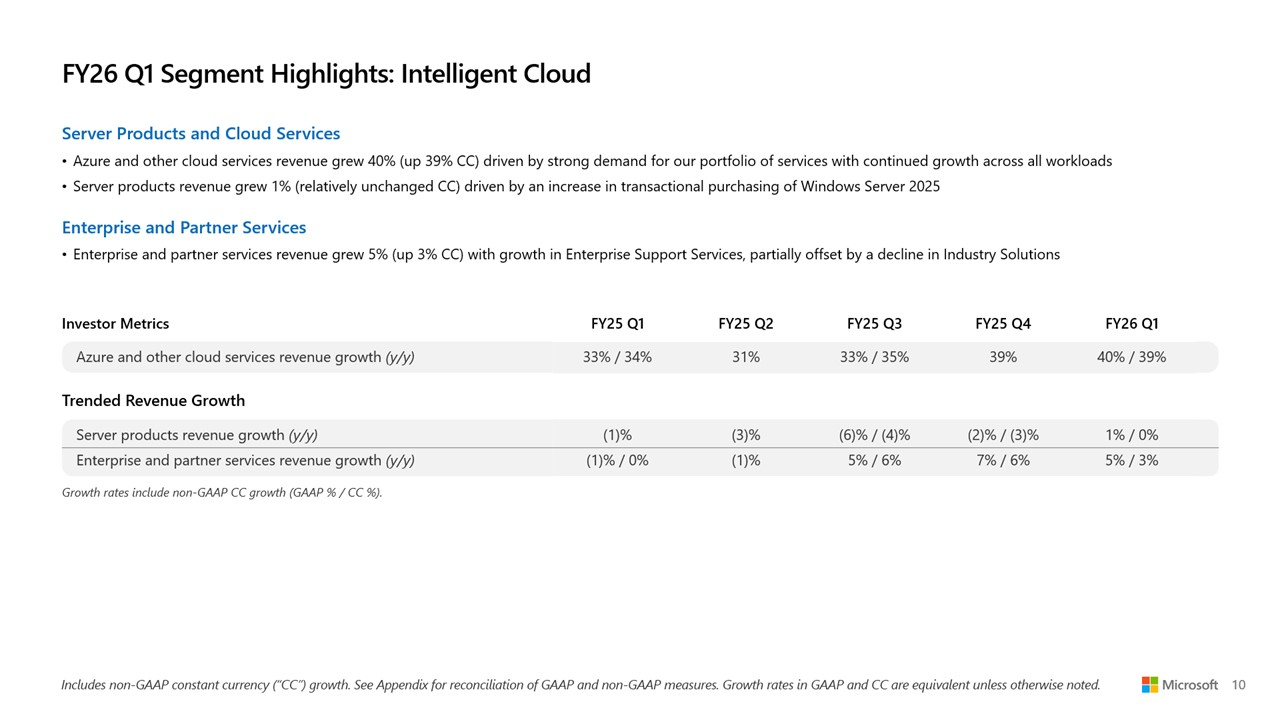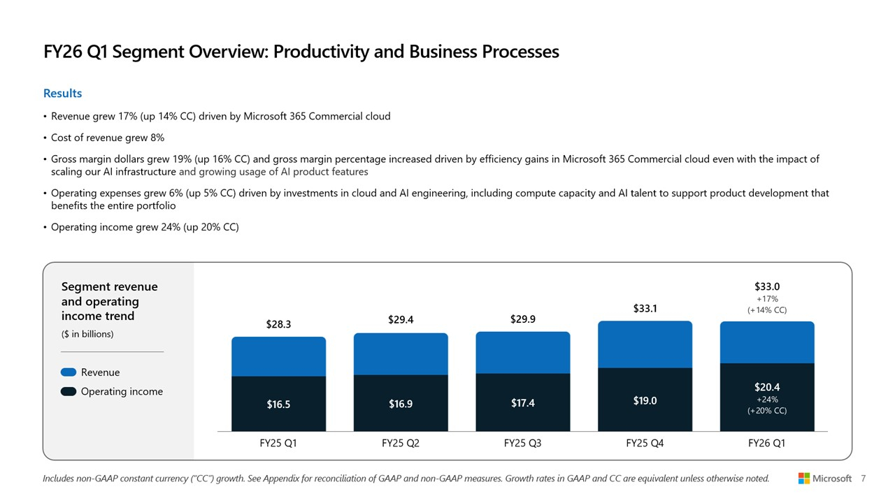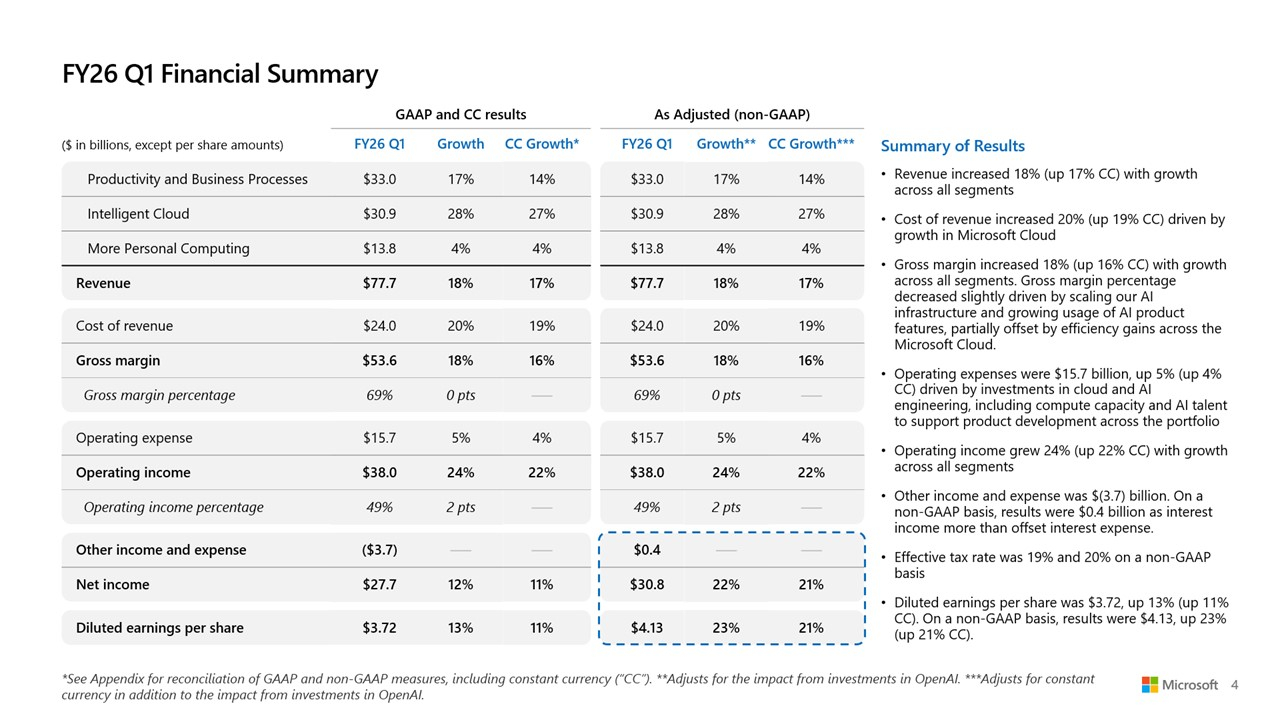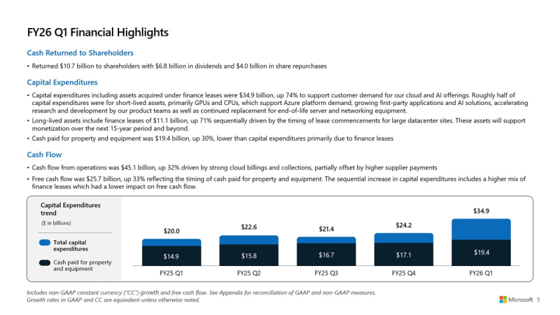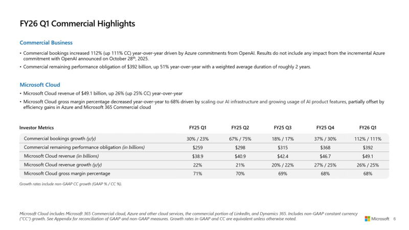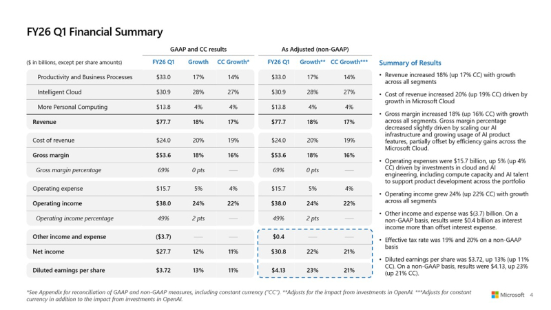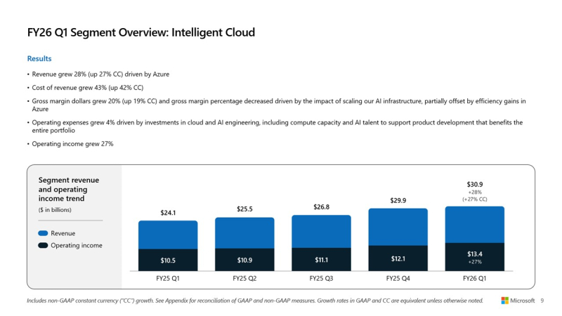 Большие расходы на большой ИИ: Microsoft увеличила выручку и прибыль, но акции упали из-за роста капзатрат на ЦОД и ускорителиMicrosoft сообщила о впечатляющем начале 2026 финансового года, обусловленном растущим спросом на облачную инфраструктуру и ИИ. Выручка за I квартал, закончившийся 30 сентября 2025 года, выросла на 18 % по сравнению с аналогичным периодом прошлого года, до $77,67 млрд, превысив консенсус-прогноз аналитиков, опрошенных LSEG, в размере $75,33 млрд. Чистая прибыль (GAAP) выросла до $27,75 млрд или $3,72 на разводнённую акцию с $24,67 млрд или $3,30 на акцию за аналогичный период прошлого года при консенсус-прогнозе от LSEG в размере $3,67 на акцию. Драйвером роста Microsoft по-прежнему оставалось подразделение Microsoft Intelligent Cloud, в которое входят облако Azure, а также Windows Server, SQL Server, GitHub, Nuance, Visual Studio и корпоративные сервисы. В сегменте «Дополнительные персональные вычисления» (More Personal Computing) выручка выросла на 4 % до $13,8 млрд благодаря росту доходов от Windows и рекламы. Это выше консенсус-прогноза StreetAccount в $12,83 млрд. Выручка Intelligent Cloud достигла $30,9 млрд (+28 %), превысив консенсус-прогноза StreetAccount в $30,25 млрд. Успех стал возможен благодаря росту Azure и других облачных сервисов на 40 %, что тоже выше консенсус-прогноза аналитиков, опрошенных StreetAccount, которые ожидали рост на 38,2 %. Общая выручка Microsoft Cloud достигла $49,1 млрд, увеличившись на 26 %, а коммерческие обязательства по исполнению контрактов выросли на 51 % до $392 млрд. Компания заявила, что ожидает рост выручки Azure во II финансовом квартале на 37 %, что немного выше оценки Visible Alpha в 36,4 %, о чём сообщает Reuters. Финансовый директор Эми Худ (Amy Hood) заявила аналитикам в ходе телефонной конференции, что рост мог бы быть выше, если бы не ограничения по вычислительным мощностям, которые, по ожиданиям Microsoft, сохранятся как минимум до конца текущего финансового года в июне 2026 года. Выручка в сегменте «Производительность и бизнес-процессы» (Microsoft Productivity and Business Processes) выросла на 17 % до $33,0 млрд, в первую очередь за счёт Microsoft 365, Dynamics 365 и LinkedIn, что выше консенсус-прогноза в $32,33 млрд, ожидаемого аналитиками, опрошенными StreetAccount. Доход от облачного сервиса Microsoft 365 увеличился на 17 %, от потребительского облачного сервиса Microsoft 365 — на 26 %, от LinkedIn — на 10 %, от Dynamics 365 — на 18 %. «Наша облачная и ИИ-фабрика планетарного масштаба, совместно с Copilots в высокодоходных областях, способствует широкому распространению и реальному влиянию, — заявил Сатья Наделла (Satya Nadella), председатель совета директоров и генеральный директор Microsoft. — Именно поэтому мы продолжаем увеличивать инвестиции в ИИ, как в основной капитал, так и в персонал, чтобы реализовать огромные возможности, которые открывают перед нами». Несмотря на рост финансовых показателей, акции Microsoft упали почти на 4 % в ходе расширенных торгов после того, как Эми Худ сообщила об ускорении роста капитальных затрат в этом финансовом году. В минувшем квартале капитальные затраты, включая финансовый лизинг, достигли $34,9 млрд, что существенно больше, чем в предыдущем квартале ($24,2 млрд), и выше прогноза в примерно $30 млрд. Среди крупных проектов — передовой ИИ ЦОД Fairwater стоимостью $3,3 млрд, который вскоре обзаведётся близнецом стоимостью $4 млрд. Примерно половина этих расходов была направлена на краткосрочные активы, связанные с расширением вычислительных мощностей и заменой оборудования, в то время как долгосрочные активы в ра