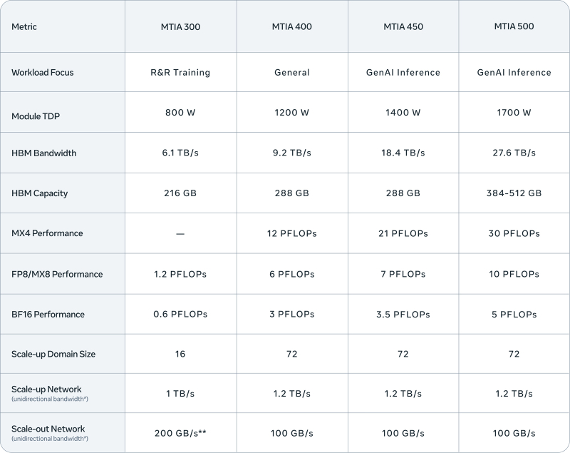 Meta✴ представила четыре новых ИИ-ускорителя MTIA — с FP8-производительностью до 10 ПфлопсКомпания Meta✴ анонсировала ИИ-ускорители MTIA (Meta✴ Training and Inference Accelerator) сразу четырёх новых поколений. Это решения MTIA 300, 400, 450 и 500: внедрение некоторых из них уже началось, тогда как развёртывание других запланировано на текущий и следующий годы. Устройства ориентированы на различные ИИ-нагрузки, включая инференс и генеративные сервисы. ИИ-процессор MTIA первого поколения (MTIA 100), напомним, дебютировал в 2023 году: изделие получило в общей сложности 128 ядер RISC-V и 128 Мбайт памяти SRAM. В 2024-м вышло решение второго поколения MTIA 200 с повышенной производительностью. В каждом из четырёх новых продуктов, по заявлениям Meta✴, упор сделан на улучшении вычислительных характеристик, пропускной способности памяти и эффективности.