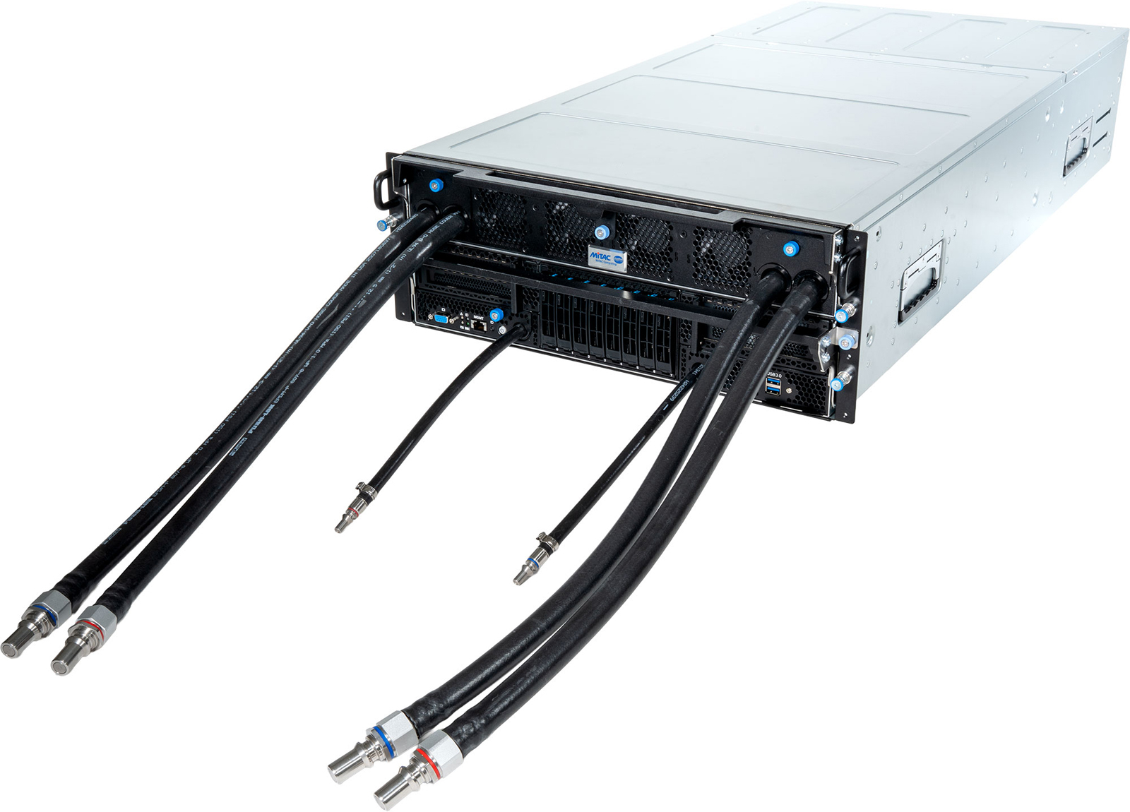 MiTAC представила ИИ-сервер G4826Z5 с ускорителями AMD Instinct MI355X и СЖОКомпания MiTAC анонсировала высокопроизводительный GPU-сервер G4826Z5 на аппаратной платформе AMD, предназначенный для ресурсоёмких задач ИИ и НРС. Кроме того, представлены стойки и вычислительные кластеры на его основе. Сервер G4826Z5U2BC-355X-755 выполнен в форм-факторе 4U. Нижняя 2U-секция содержит два процессора AMD EPYC 9005 Turin и 24 слота для модулей оперативной памяти DDR5-6400. Во фронтальной части расположены восемь отсеков для SFF-накопителей; кроме того, есть два внутренних коннектора M.2 для SSD (NVMe). Верхний 2U-модуль несёт на борту восемь ускорителей AMD Instinct MI355X, оборудованных 288 Гбайт памяти HBM3E с пропускной способностью до 8 Тбайт/с. Машина G4826Z5 получила систему жидкостного охлаждения, которая охватывает CPU- и GPU-секции. Предусмотрена функция обнаружения утечек. Подсистема питания с резервированием выполнена по схеме: 1+1 мощностью 3200 Вт и 3+3 мощностью 15 600 Вт. Все блоки питания имеют сертификат 80 Plus Titanium и допускают горячую замену. На основе G4826Z5 формируется стоечная система (MR1100L-64355X-01): она содержит восемь GPU-серверов, что в сумме даёт 64 ускорителя и 18,4 Тбайт памяти HBM3E. Стойка также укомплектована коммутаторами 400GbE на 64 и 32 порта, двумя коммутаторами 1GbE на 48 портов, сервером управления B8056G68CE12HR-2T-TU, сервером хранения B8056T70AE26HR-2T-HE-TU и блоком распределения охлаждающей жидкости (CDU) в формате 4U. В свою очередь, стойки объединяются в кластеры из четырёх и восьми штук. Это в сумме обеспечивает 32 и 64 сервера GPU и 256 и 512 ускорителей Instinct MI355X соответственно. Таким образом, максимальная конфигурация включает приблизительно 147 Тбайт памяти HBM3E.