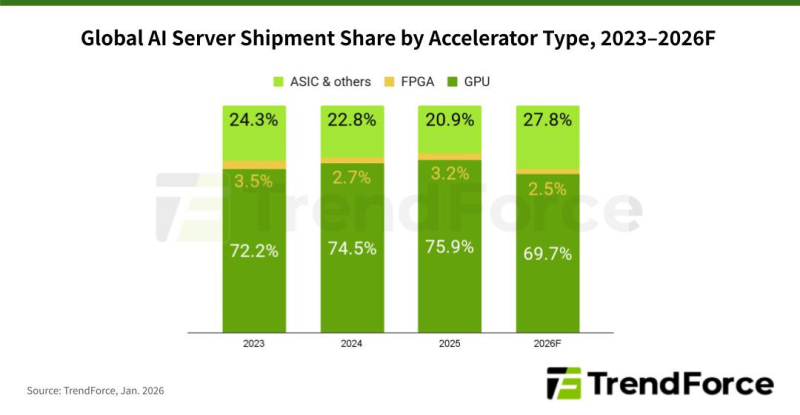 TrendForce: мировые поставки ИИ-серверов в 2026 году поднимутся на 28 %По данным компании TrendForce, глобальные поставки серверов в 2025 году поднялись на 7,8 % по сравнению с предыдущим годом, тогда как в сегменте ИИ-систем зафиксирован рост на 24,2 % (абсолютные цифры не приводятся). Аналитики полагают, что в 2026-м общий объём рынка увеличится на 12,8 %, а отгрузки серверов для ИИ-задач подскочат на 28,3 %. В 2025 году, согласно оценкам TrendForce, в сегменте ИИ-серверов доминировали системы, оснащённые ускорителями на базе GPU: их доля составила 75,9 %. Ещё 20,9 % пришлось на машины с ASIC и ускорителями других типов, 3,2 % — на устройства с FPGA. В 2026 году, как полагают эксперты, расстановка сил изменится. Связано это с тем, что в 2024–2025 гг. нагрузки ИИ были сфокусированы преимущественно на обучении больших языковых моделей (LLM) с огромным количеством параметров. Однако к концу 2025 года наметился сдвиг в сторону инференса и использования ИИ-агентов. Прогнозируется, что по итогам 2026-го доля ИИ-серверов на основе GPU сократится до 69,7 %. Вместе с тем до 27,8 % поднимется доля систем, в состав которых входят ASIC. На машины с FPGA при этом придётся 2,5 %. Прогнозируется также, что темпы роста поставок ИИ-серверов на базе ASIC будут выше, чем темпы роста отгрузок GPU-систем. Отмечается, что такие компании, как Google и Meta✴, ускоряют разработку собственных ASIC. TrendForce полагает, что совокупные капитальные затраты пяти крупнейших североамериканских провайдеров облачных услуг — Google, AWS, Meta✴, Microsoft и Oracle — увеличатся в 2026 году на 40 % по отношению к предыдущему году. Помимо масштабного развития инфраструктуры дата-центров, часть средств пойдёт на обновление серверов общего назначения, приобретённых во время бума облачного рынка в 2019–2021 гг.