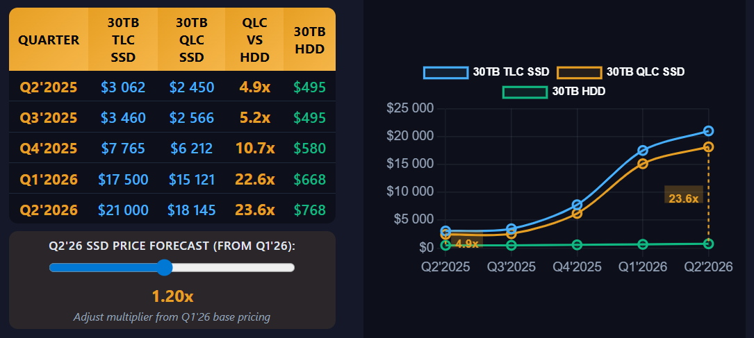 Цены на 30-Тбайт SSD для ЦОД за год взлетели в шесть раз — теперь они в 22,6 раз дороже HDDКомпания VDURA, специализирующаяся на программно-определяемых СХД для задач ИИ и HPC, обнародовала свежие данные Flash Volatility Index, говорящие о том, что цены на SSD корпоративного класса продолжают стремительно расти. Связано это с высоким спросом на накопители со стороны гиперскейлеров и операторов облачных платформ. По оценкам, стоимость SSD вместимостью 30 Тбайт на базе чипов TLC NAND подскочила на 472 % в период со II квартала 2025 года по первую четверть 2026-го — с $3062 до $17 500. Иными словами, зафиксирован 5,7-кратный рост. Вместе с тем цена на SSD с чипами QLC NAND за тот же период увеличилась с $2450 до $15 121, то есть, в 6,2 раза. Подчеркивается, что только за три недели марта — с 4 по 23 число — стоимость SSD корпоративного класса увеличившись почти на четверть. В результате, разница в цене между SSD типа QLC на 30 Тбайт и HDD аналогичной ёмкости взлетела с 4,9 раза во II квартале 2025 года до 22,6 раза в I четверти 2026-го. Наблюдающаяся ситуация приводит к фундаментальным изменениям экономики систем хранения типа All-Flash. В частности, VDURA с применением собственного инструмента Storage Economics Optimizer Tool проанализировала стоимость владения платформой хранения суммарным объёмом 25 Пбайт, способной обеспечивать устойчивую производительность на уровне 1000 Гбайт/с. По ценам II квартала 2025 года такая система, выполненная исключительно на базе SSD, потребовала бы вложений в размере $9,69 млн на протяжении трёхлетнего периода. Ко II четверти 2026-го соответствующие прогнозируемые затраты выросли до $48,17 млн, то есть, примерно в пять раз. Вместе с тем развёртывание и поддержание гибридной архитектуры SSD+HDD той же вместимости с сопоставимой производительностью обойдётся в $11,37 млн. Для смягчения проблемы резкого роста стоимости SSD компания VDURA предлагает программу Flash Relief Program.