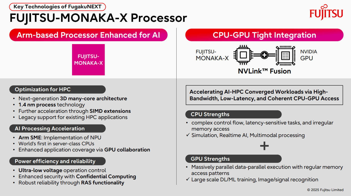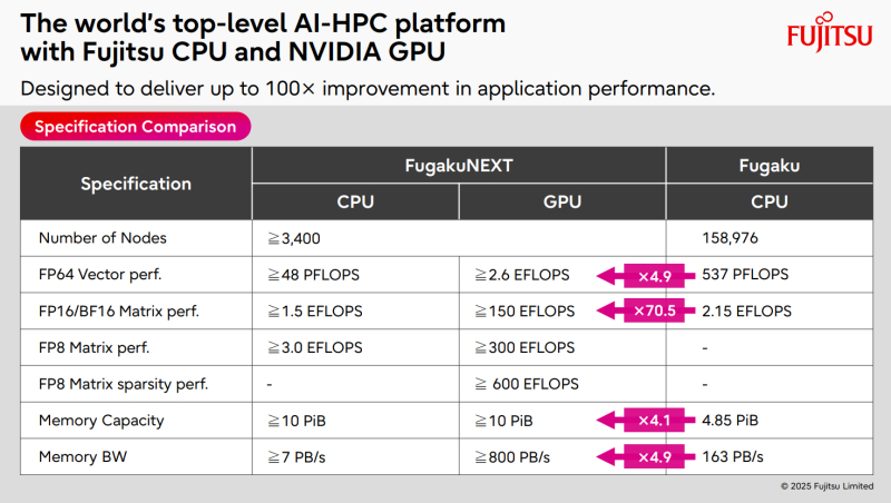 ИИ-производительность японского суперкомпьютера FugakuNEXT превысит 600 ЭфлопсКомпания Fujitsu поделилась информацией о суперкомпьютере следующего поколения FugakuNEXT (Fugaku Next), который создаётся совместно с японским Институтом физико-химических исследований (RIKEN). Проект реализуется при поддержке Министерства образования, культуры, спорта, науки и технологий Японии (MEXT). FugakuNEXT придёт на смену вычислительному комплексу Fugaku, который в 2020 году стал самым высокопроизводительным суперкомпьютером в мире. В рейтинге ТОР500 от июня 2025 года эта НРС-система занимает седьмое место с FP64-быстродействием приблизительно 442 Пфлопс (теоретическая пиковая производительность достигает 537,21 Пфлопс). Разработку архитектуры FugakuNEXT планируется полностью завершить к середине 2028 года, после чего начнутся производство и монтаж суперкомпьютера. В эксплуатацию система будет введена не ранее середины 2030 года. Известно, что в основу FugakuNEXT лягут Arm-процессоры Fujitsu MONAKA-X, при производстве которых предполагается использовать 1,4-нм технологию. Чипы получат до 144 вычислительных ядер. Кроме того, в состав машины войдут ИИ-ускорители NVIDIA, для связи которых с CPU планируется задействовать шину NVLink Fusion. Платформа также получит новые интерконнекты для горизонтального и вертикального масштабирования. В материалах Fujitsu говорится, что FugakuNEXT получит в общей сложности свыше 3400 узлов CPU и GPU. Их объём памяти превысит 10 ПиБ (Пебибайт). Агрегированная пропускная способность памяти в случае CPU-блоков составит более 7 Пбайт/с, GPU-модулей — свыше 800 Пбайт/с против 163 Пбайт/с у нынешней системы Fugaku. Кроме того, раскрываются ожидаемые показатели ИИ-быстродействия FugakuNEXT. У CPU-секции производительность превысит 48 Пфлопс в режиме FP64, 1,5 Эфлопс на операциях FP16/BF16 и 3 Эфлопс в режиме FP8. В случае GPU-раздела быстродействие FP64, FP16/BF16, FP8 и FP8 Sparse составит более 2,6 Эфлопс, 150 Эфлопс, 300 Эфлопс и 600 Эфлопс соответственно.