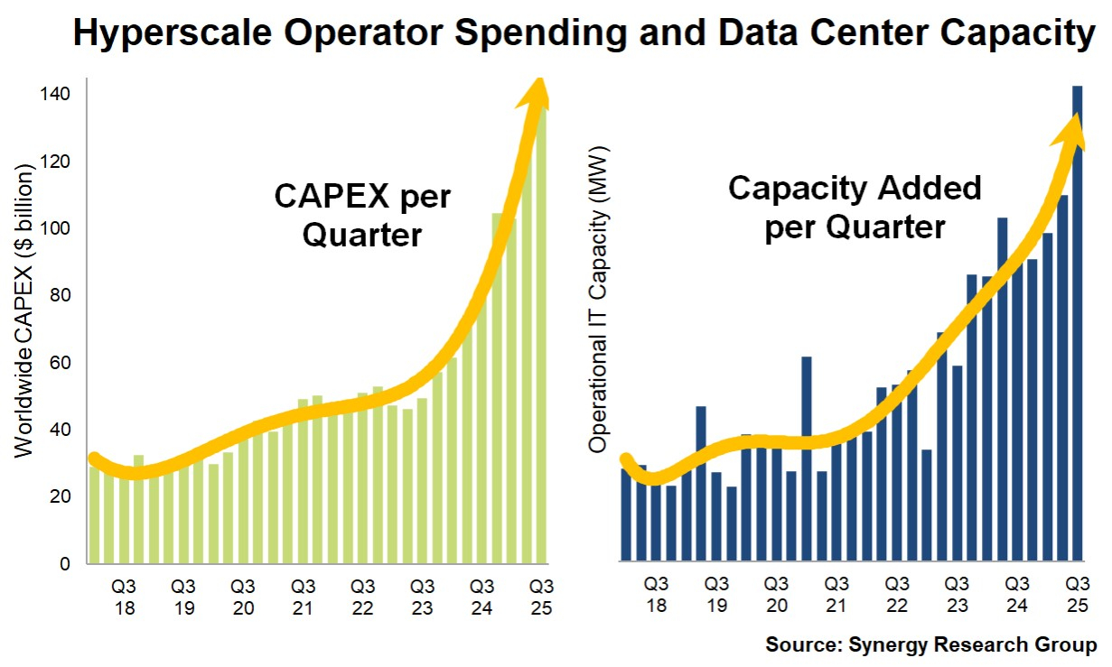 Количество ЦОД гиперскейлеров выросло с 2018 года почти втроеСогласно данным Synergy Research Group за III квартал 2025 года, в мире насчитывается уже 1297 ЦОД гиперскейлеров, что почти втрое больше, чем в начале 2018 года. При этом их общая мощность увеличилась более чем в четыре раза, поскольку средний размер ЦОД продолжает расти. Аналитики отметили, что рост основных показателей рынка резко ускорился после запуска ChatGPT в конце 2022 года благодаря росту инвестиций в области ИИ. За последние три года ежеквартальные капитальные затраты гиперскейлеров выросли почти на 180 %, достигнув в III квартале $142 млрд. Фактические мощности росли почти такими же темпами — на 170 % каждый квартал. Благодаря этому доля США на мировом рынке с точки зрения мощностей выросла за три года с 52 до 55 %, укрепив их доминирующее положение. Исследование Synergy Research Group основано на анализе инфраструктуры ЦОД 21 крупнейших в мире компаний в сфере облачных и интернет-сервисов, включая крупнейших операторов в сфере SaaS, IaaS, PaaS, поисковых систем, социальных сетей, электронной коммерции и игр. Лидируют в рейтинге провайдеры облачных сервисов Amazon, Microsoft и Google, обладающие самой обширной инфраструктурой ЦОД как в США, так и за их пределами. На них приходится 58 % всех мощностей ЦОД гиперскейлеров. За ними следуют Meta✴, Alibaba, Tencent, Oracle, Apple, ByteDance, а затем другие, менее крупные гиперскейлеры. Прогноз Synergy Research Group в значительной степени основан на отслеживании планов гиперскейлеров по строительству ЦОД. В настоящее время в базе данных Synergy насчитывается 770 объектов, находящихся на различных этапах планирования, строительства или оснащения. Аналитики отметили увеличение в минувшем квартале темпов роста по количеству введённых ЦОД, эксплуатационной мощности, связанными с ними капитальным затратам, доходам компаний и доходам от облачных сервисов. Также аналитики отметили увеличение количества будущих объектов. Synergy пересмотрела свой пятилетний прогноз в сторону повышения по нескольким ключевым показателям, ожидая, что общая мощность ЦОД гиперскейлеров удвоится всего за двенадцать кварталов. Это «подчёркивает масштаб и скорость, с которой инвестиции в инфраструктуру, основанные на ИИ, меняют глобальные рынки облачных вычислений», — отметила компания.