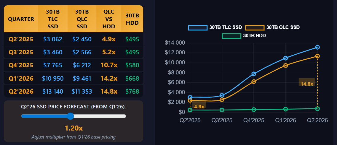 SSD для корпоративных клиентов теперь в 16 раз дороже, чем HDDПоставщик СХД для HPC и ИИ ЦОД — компания VDURA заявила, что ценовая пропасть между SSD и HDD корпоративного уровня расширяется, поскольку цены на твердотельные накопители растут значительно быстрее, чем на жёсткие диски, сообщает Blocks & Files. Новая информация, в частности, должна положить конец рассуждениям о том, что SDD окончательно вытеснят HDD, о чём так мечтает Pure Storage, по крайней мере, до тех пор, пока цены на NAND-память значительно не упадут. VDURA полагает, что критические изменения рынка особенно отразятся на ИИ, HPC и других средах с интенсивным использованием данных, где требования к производительности памяти не изменятся даже по мере роста цен. Компания ежеквартально публикует т.н. Flash Volatility Index (FVI) и Storage Economics Optimizer Tool для мониторинга изменений цен на SSD и HDD и помогает клиентам хотя бы отчасти компенсировать стремительный рост цен на твердотельные накопители. По данным VDURA, со II квартала 2025 года по I квартал 2026 цена 30-Тбайт TLC SSD выросла на 257 %, с $3062 до $10 950, а цены на HDD за тот же период выросли на 35 %, что расширило ценовой разрыв. Так, разница в цене TLC SSD и HDD выросла с 6,2 раза во II квартале 2025 года до 16,4 раза в I квартале 2026-го, а в случае QLC SSD — в 14,2 раза. В результате значительно выросли риски для All-Flash архитектур. Утверждаются, что отправленные несколько месяцев назад коммерческие предложения теперь требуют полного пересмотра бюджетов. The Flash Volatility Index помогает отследить, как изменения в цепочке поставок флэш-накопителей ведут к изменению цен на реальном розничном рынке и как это сравнимо с рынком HDD. Storage Economics Optimizer Tool позволяет клиентам моделировать общую стоимость системы с учётом различных архитектур хранения, целевых показателей производительности и др. VDURA использовала Storage Economics Optimizer Tool для оценки воздействия волатильности цен флеш-накопителей для распространённых архитектур хранилищ на 25 Пбайт, обеспечивающих скорость передачи данных 1 Тбайт/с. По данным на II квартал 2025 года, хранилище, использовавшее исключительно SSD, предполагало годовые затраты в размере $8,50 млн. К I кварталу 2026 года та же конфигурация подорожала до $24,54 млн, рост составил 189 %, в основном из-за роста цен на SSD. При этом утверждается, что архитектуры, комбинирующие использование SSD и HDD, позволяют значительно снизить рост цен и эффект от возможного неожиданного скачка цен на рынке твердотельных накопителей, с сохранением необходимых уровней производительности. В докладе FVI отражается усугубляющееся ценовое давление по всем уровнями инфраструктурного стека. Со II квартала 2025 года по I квартал 2026 года цены на оперативную память (DRAM) взлетели на 205 %, рост обусловлен высоким спросом на системы на основе ИИ-ускорителей, требующие больших объёмов памяти. Высокоскоростные сетевые компоненты столкнулись с похожими ограничениями, что дополнительно сказывается на цене систем. Особенно это затратно для вариантов с большим количеством узлов. Согласно данным из доклада FVI, многолетние договоры о покупке компонентов гиперскейлерами фактически заблокировали значительную часть мощностей для производства SSD до конца 2026 г. В то же время крупномасштабные инфраструктурные ИИ-проекты продолжают «поглощать» оставшиеся поставки. По оценкам экспертов, ценовое давление может сохраниться и в 2027 году и позже. Как заявляют в VDURA, после 