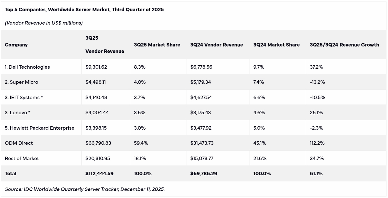 Мировой рынок серверов бьёт рекорды благодаря ИИ: квартальная выручка превысила $110 млрд, а Китай резко нарастил свою долюКомпания International Data Corporation (IDC) обнародовала результаты исследования мирового рынка серверов в III квартале уходящего года. Продажи в денежном выражении достигли рекордных $112,4 млрд: это на 61,1 % больше по сравнению с аналогичным периодом прошлого года, когда отгрузки оценивались в $69,79 млрд. При этом продажи СХД показали минимальный рост год к году. Квартальная выручка от продаж серверов с архитектурой x86 увеличилась на 32,8 % — до $76,3 млрд. Системы с процессорами на других архитектурах принесли производителям $36,2 млрд, показав рост на 192,7 % в годовом исчислении. Более половины от общего объёма отрасли обеспечили серверы, оборудованные ускорителями: на фоне стремительного внедрения ИИ поставки таких машин в денежном выражении поднялись на 49,4 % по сравнению с III четвертью 2024 года. С географической точки зрения самые высокие темпы роста продемонстрировали США — плюс 79,1 % в годовом исчислении: этому способствовало увеличение продаж ИИ-серверов на 105,5 %. Канада показала прибавку в размере 69,8 %. В Китае зафиксировано увеличение поставок в денежном выражении на 37,6 %: при этом на КНР пришлась почти пятая часть квартальной выручки в мировом масштабе. В Азиатско-Тихоокеанском регионе (без учёта Китая и Японии) рост составил 37,4 %, в регионе ЕМЕА (Европа, Ближний Восток и Африка) — 31,0 %, в Японии — 28,1 %. В Латинской Америке продажи поднялись на 4,1 %. Рейтинг ведущих поставщиков серверов по итогам III квартала 2025 года возглавляет Dell Technologies с выручкой в размере $9,3 млрд и долей 8,3 %. На втором месте располагается Supermicro с $4,5 млрд и 4,0 %, а замыкает тройку IEIT Systems с $4,14 млрд и 3,7 %. На четвёртой и пятой строках находятся Lenovo и НРЕ, у которых выручка составила соответственно $4,0 млрд и $3,4 млрд, а рыночная доля — 3,6 % и 3,0 %. При этом у всех перечисленных компаний доли сократились по сравнению с III кварталом 2024 года.