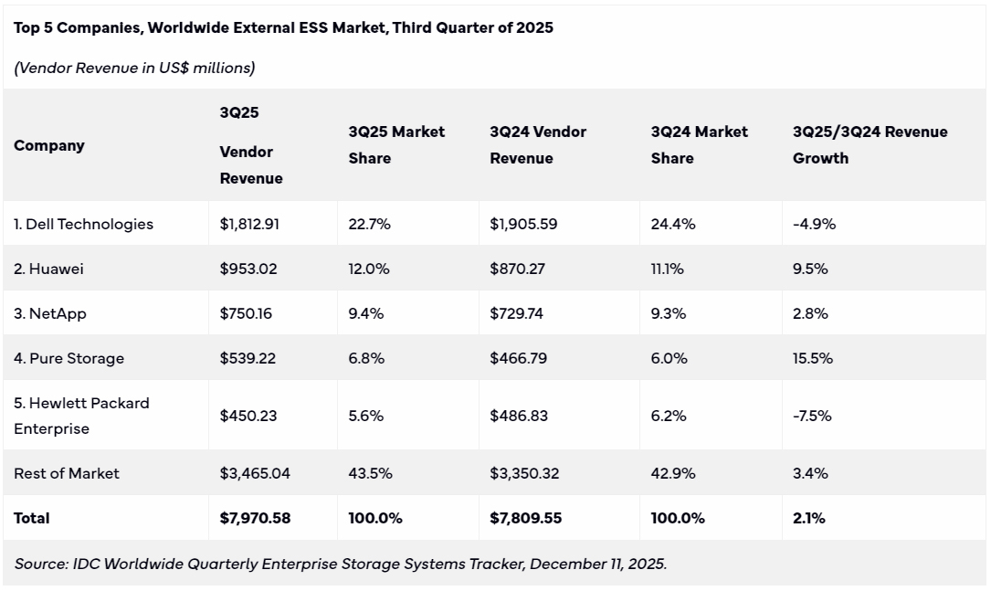 Мировой рынок СХД вырос благодаря спросу на массивы All-Flash, а выиграли от этого Pure Storage, Huawei и NetAppПо данным International Data Corporation (IDC), продажи систем хранения данных (СХД) корпоративного класса в мировом масштабе достигли $7,97 млрд по итогам III квартала текущего года. Это на 2,1 % больше по сравнению с тем же периодом 2024-го, когда объём рынка оценивался в $7,81 млрд. Наибольший рост выручки год к году показали Pure Storage (+15,5 %), Huawei (+9,5 %) и NetApp (+2,8 %), а Dell Technologies (-4,9 %) и HPE (-7,5 %) показали падение Положительная динамика показана благодаря поставкам массивов All-Flash: их продажи в годовом исчислении увеличились в деньгах на 17,6 %. Связано это с растущим спросом на высокопроизводительные системы, ориентированные на ресурсоёмкие задачи в области ИИ. Вместе с тем спрос на гибридные СХД и на решения на базе HDD уменьшился по отношению к III четверти 2024 года на 9,8 % и 6,3 % соответственно. В ценовом разрезе доминируют системы среднего класса стоимостью от $25 тыс. до $250 тыс. На такие продукты пришлось 67,5 % продаж, а их поставки увеличились год к году на 8,1 % в денежном исчислении. С другой стороны, спрос на СХД верхнего ценового диапазона (дороже $250 тыс.) снизился на 9,0 %, тогда как продажи изделий начального уровня (дешевле $25 тыс.) упали на 8,0 %. С географической точки зрения самый высокий рост отмечен в Японии, Канаде и регионе EMEA (Европа, Ближний Восток и Африка) — на 14,4 %, 12,6 % и 10,5 % соответственно. В Китае продажи поднялись на 9,5 % по отношению к III кварталу прошлого года, в Азиатско-Тихоокеанском регионе (без учёта КНР и Японии) — на 8,6 %. В Латинской Америке произошло снижение на 0,9 %, тогда как в США рынок сократился на 9,9 %. Лидером сектора является Dell Technologies с выручкой в размере $1,81 млрд и долей в 22,7 %. На втором месте располагается Huawei с $953,02 млн и 12,0 %, а замыкает тройку NetApp с $750,16 млн и 9,4%. Четвёртая строка в рейтинге досталась Pure Storage, продажи которой составили $539,22 млн, рыночная доля — 6,8 %. На пятой позиции находится НРЕ с $450,23 млн и 5,6 %. Все прочие отраслевые игроки вместе взятые получили $3,47 млрд, заняв 43,5 %.