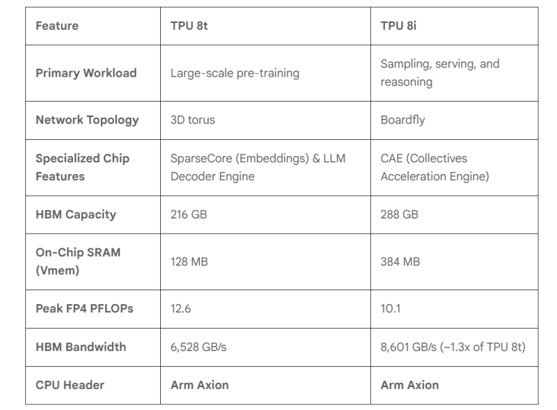 Для обучения и инференса — Google анонсировала ИИ-ускорители TPU 8t и TPU 8iGoogle представила два TPU восьмого поколения: TPU 8t для обучения ИИ и TPU 8i для ИИ-инференса. Компания и раньше экспериментировала с различными вариантами TPU, в частности, со своими чипами пятого поколения V5p и V5e, но последние поколения, такие как Trillium и Ironwood, в основном следовали единому подходу. По словам Амина Вахдата (Amin Vahdat), старшего вице-президента и главного технолога Google по ИИ и инфраструктуре, TPU 8t и TPU 8i — результат десятилетней разработки (первые TPU были анонсированы в мае 2016 г.), специально созданные для обеспечения работы суперкомпьютеров следующего поколения с высокой эффективностью и масштабируемостью. Вахдат описывает TPU 8t как «мощную платформу для обучения», созданную для «сокращения цикла разработки моделей с месяцев до недель». Она предлагает в 2,8 раза лучшее соотношение цены и производительности, чем предыдущее поколение. В TPU 8t используются векторные, матричные и SparseCore-ядра, дополненные 128 Мбайт SRAM и 216 Гбайт HBM (6,5 Тбайт/с). FP4-производительность составляет до 12,6 Пфлопс. Для вертикального масштабирования используется межчиповый интерконнект (ICI) со скоростью 19,2 Тбит/с (в каждую сторону), для горизонтального — 400 Гбит/с. Кластер с TPU 8t может масштабироваться до 9,6 тыс. чипов, предлагая 2 Пбайт памяти HBM, 121 Эфлопс и вдвое большую межчиповую пропускную способность по сравнению с Ironwood, позволяя самым сложным моделям использовать единый, огромный пул памяти. 8t-кластеры объдиняет сеть Virgo Network, которая использует плоскую двухуровневую неблокирующую топологию, обеспечивает четырёхкратное увеличение пропускной способности в ЦОД и построена на коммутаторах с высокой степенью защиты, что сокращает количество сетевых уровней. В рамках одного ЦОД Virgo Network позволяет объединить до 134 тыс. чипов, что даёт до 47 Пбит/с неблокирующих соединений и более 1,6 Ифлопс с почти линейным масштабированием. А в рамках нескольких ЦОД в единый кластер можно объединить более 1 млн TPU. В TPU 8t используются технологии TPUDirect RDMA и TPUDirect Storage. TPU Direct RDMA обеспечивает прямую передачу данных между HBM и NIC, минуя CPU и DRAM хоста, а TPUDirect Storage напрямую связывает память TPU и СХД, таким как 10T Lustre, которая обеспечивает до 10 Тбайт/с, что даёт на порядок более быстрый доступ к хранилищу в сравнении с Ironwood и позволяет доставлять петабайты данных к ускорителям. Кроме того, TPU 8t получили расширенные возможности RAS. К ним относятся телеметрия в реальном времени для десятков тысяч чипов, автоматическое обнаружение неисправных каналов ICI и перенаправление трафика без прерывания задания, а также оптическая коммутация каналов (OCS), которая перенастраивает оборудование в случае сбоев без участия человека. Всё это позволяет довести уровень утилизации чипа до 97 %. В свою очередь, TPU 8i создан для обработки «сложной, совместной, итеративной работы множества специализированных агентов», которые появляются с развитием агентного ИИ. TPU 8i использует 288 Гбайт памяти HBM (8,6 Тбайт/с) в паре с 384 Мбайт SRAM — втрое больше, чем в предыдущем поколении. По словам Google, такой объём SRAM помогает TPU 8i удерживать большую часть KV-кеша на кристалле, что значительно сокращает время простоя ядер во время декодирования длинных контекстов. Компания отказалась от SparseCores в пользу нового встроенного механизма ускорения коллективных операций (CAE), снижая задер