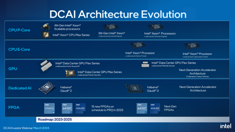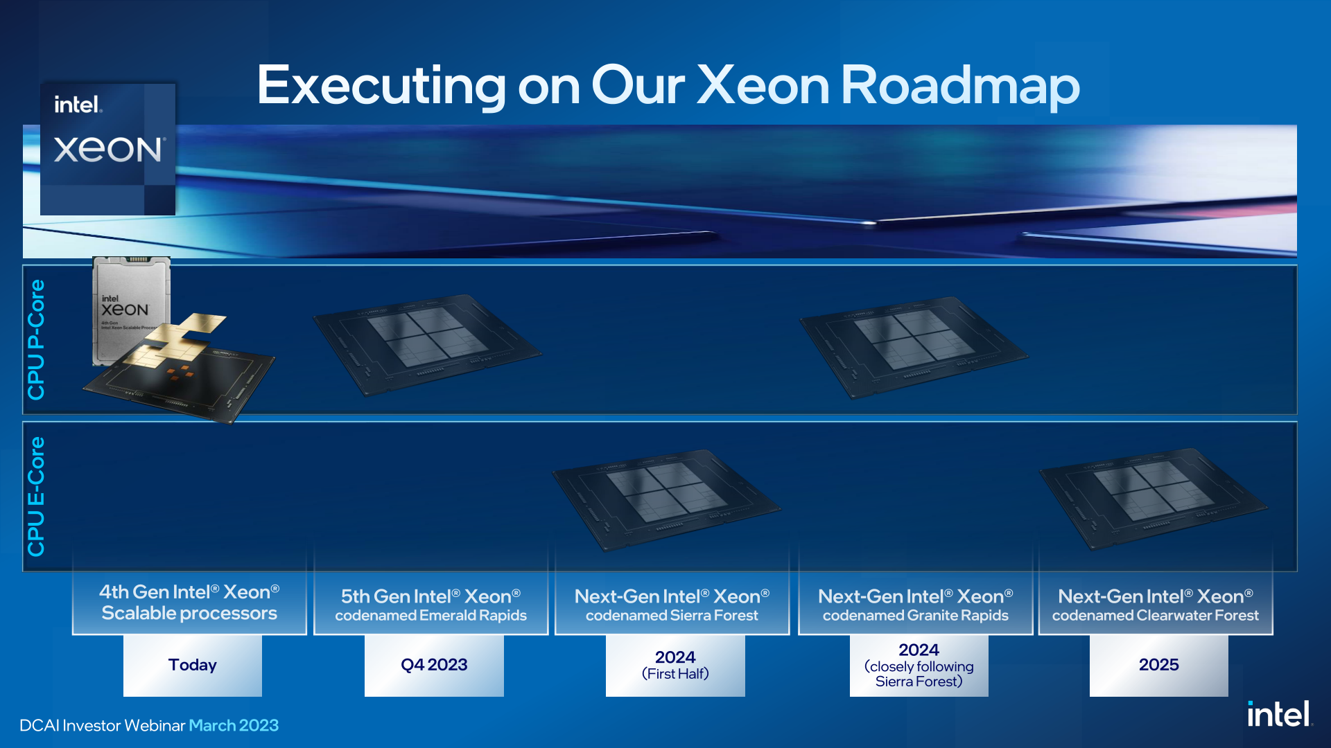 В 2023 году Intel выпустит Xeon Emerald Rapids и подготовит полтора десятка FPGA, а чипы Sierra Forest и Granite Rapids появятся уже в 2024 годуВ ходе мероприятия для инвесторов Intel подтвердила свои планы по противодействию процессорам AMD EPYC Bergamo, в которых будет использоваться архитектура с высокой плотностью ядер Zen4c, а также всё нарастающему давлению Arm. Intel придерживается планов по созданию собственных архитектур с производительными и энергоэффективными ядрами для чипов Xeon. Intel объявила, что рассчитывает выпустить следующее, пятое по счёту поколение процессоров Xeon Scalable под кодовым названием Emerald Rapids (EMR), преемников Sapphire Rapids (SPR), в IV квартале 2023 года. Компания также продемонстрировала чип Emeralds Rapids, состоящий из двух чиплетов (тайлов в терминологии Intel). Sapphire Rapids, напомним, имеется четыре тайла меньших размеров. Сообщается, что образцы Emerald Rapids уже доступны избранным заказчикам. Не вдаваясь особо в технические подробности, компания рассказала, что Emerald Rapids будет работать в том же диапазоне TDP, что и Sapphire Rapids, что повысит общую производительность платформы в пересчёте на Вт. Учитывая то, что Emerald Rapids будет использовать ту же платформу LGA 4677, что и Sapphire, заказчики смогут заменить Sapphire на Emerald в существующих решениях. Такой подход позволит легко модернизировать уже внедрённые системы, а в случае производителей оборудования — ускорить вывод Emerald Rapids на рынок. Emerald Rapids будет построен на том же техпроцессе Intel 7. Это означает, что прирост производительности должен быть обеспечен за счёт архитектурных улучшений. Intel сообщила о «повышенной плотности ядер», поэтому можно предположить, что у Emerald Rapids будет больше ядер в сравнении с Sapphire Rapids. Вслед за Emerald Rapids компания планирует начать в 2024 году поставки чипов следующего поколения Granite Rapids (GNR) на базе производительных P-ядер. Сообщается, что вычислительные тайлы Granite Rapids будут выпускаться с использованием техпроцесса Intel 3. Intel также впервые сообщила, что Granite Rapids будут поддерживать MCR DIMM (DDR5-8800+) и обеспечат ПСП в пределах 1,5 Тбайт/с (12 каналов памяти). Ещё одной особенностью станет полный переход на чиплетную компоновоку с независимым IO-тайлом. Первые образцы Granite Rapids уже тестируются некоторыми заказчиками. В первой половине 2024 года должен выйти и процессор Sierra Forest (SRF), первый Intel Xeon с энергоэффективными E-ядрами (следующее за Gracemont поколение) общим числом до 144 единиц. Сообщается, что Sierra Forest и Granite Rapids будут использовать одну и ту же платформу Birch Stream. Следует отметить, что чипы Sierra Forest появятся несколько раньше, чем Granite Rapids, и тоже будут использовать техпроцесс Intel 3, а также IO-тайлы. Отмечается, что Sierra Forest даже в текущем виде оказались на удивление стабильно работающими. Более того, их уже тестирует как минимум один заказчик Intel. На смену Sierra Forest придут в 2025 году чипы Clearwater Forest (CWF), которые станут первыми в семействе Intel Xeon, основанными на техпроцессе Intel 18A. По словам Intel, её заказчики не хотят серверные процессоры смешанной архитектуры, то есть требуют чипы либо только с P-ядрами, либо только с E-ядрами. Sierra Forest сейчас является, пожалуй, наиболее важным продуктом для Intel и для демонстрации производственных возможностей, и для сохранения заказчиков среди гиперскейлеров. Что касается ускорителей, то компания в этом году планирует подготовить сразу 15 различных FPGA в сериях Agilex и Stratix, а также eASIC. Intel, как уже говорилось ранее, не забрасывает рабо