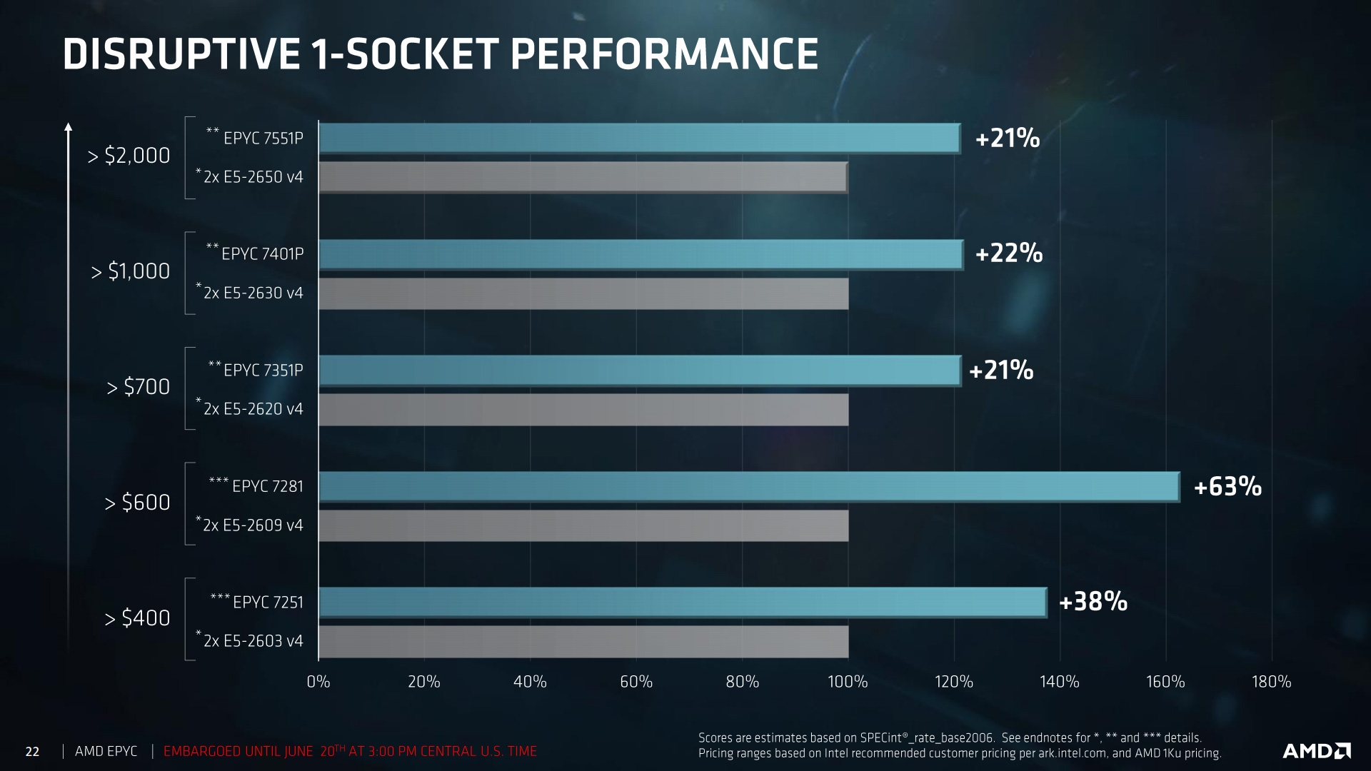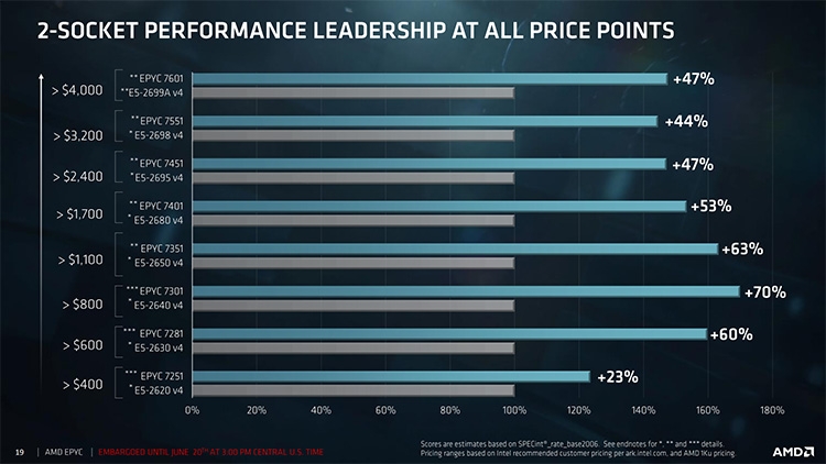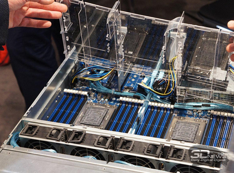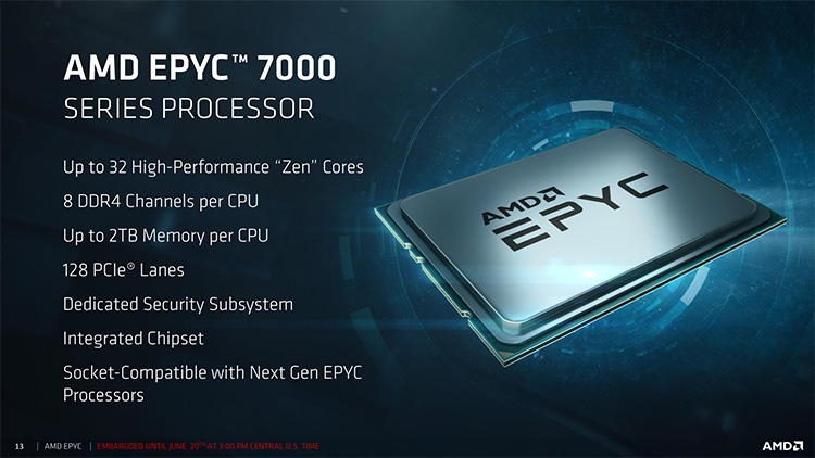 Представлено семейство «4-в-1» процессоров AMD EPYC 7000В ночь со вторника на среду AMD официально представила первые серверные процессоры с 14-нм микроархитектурой Zen, скромно именуемые EPYC. Семейство включает 8-, 16-, 24- и 32-ядерные модели «7000-й» серии для однопроцессорных и двухпроцессорных серверов (узлов). В распоряжение OEM-сборщиков поступят 12 CPU с ориентировочной стоимостью от $400 до $4000. Конструкция AMD EPYC довольно примечательна. По крайней мере старшие 32-ядерные модели будут состоять из четырёх кристаллов (8-ядерные блоки Zeppelin), сообщающихся друг с другом посредством высокоскоростного интерфейса Infinity Fabric. Последний также отвечает за взаимодействие двух процессоров в одной системе. ![]() ![]() Разъём SP3 (4094 контакта) также можно назвать составным, но стоит отметить, что CPU EPYC — не просто «двойной Ryzen Threadripper», а полноценное серверное решение с поддержкой больших объёмов памяти, массы разнообразных накопителей, специализированных графических адаптеров и ускорителей на базе GPU. ![]() О преимуществах процессоров EPYC 7000 известно не первый день. Среди них — восьмиканальный доступ к памяти, поддержка 2 Тбайт RAM и наличие у каждого CPU 128 линий PCI Express 3.0. ![]() Недавняя утечка сведений об EPYC оказалась, собственно, утечкой, а не вымыслом. AMD действительно готова предложить клиентам девять 1P/2P и три 1P процессора с 8–32 ядрами и 16–64 потоками обработки данных. Из-за обилия блоков системной логики в структуре кристалла частоты EPYC 7000 Series невысоки, а TDP — как раз наоборот. Семейство возглавил 32-ядерный процессор EPYC 7601 с частотой 2,2/3,2 ГГц, 64 Мбайт кеш-памяти третьего уровня и тепловыделением до 180 Вт. Часть CPU имеют настраиваемый TDP в 155/170 Вт — таким образом, у системных интеграторов будет выбор между режимами энергосбережения и максимальной производительности в работе серверов. ![]() ![]() AMD не сомневается в преимуществе своих решений над процессорами Broadwell-EP конкурента (Intel). По мнению маркетологов компании, EPYC 7000 намного превосходят Xeon E5-2600 v4 во всех отношениях. В некоторых случаях одного EPYC будет достаточно, чтобы заменить тандем Xeon. AMD надеется, что двусторонний интерфейс Infinity Fabric с пропускной способностью 38 Гбайт/с на канал и 152 Гбайт/с между CPU-разъёмами позволит кристаллам Zeppelin эффективно взаимодействовать друг с другом. В рамках одного чипа каждый Zeppelin может обмениваться данными со всеми своими собратьями, а в пределах 2P-платформы реализован своего рода покристальный CrossFire. ![]() ![]() В Саннивейле рекомендуют серверы в составе EPYC и ускорителей Radeon Instinct на чипах Vega и Polaris. Сотрудничество с AMD в деле создания высокопроизводительных серверов подтвердили компании HPE, Dell, ASUS, Gigabyte, Inventec, Lenovo, Sugon, Supermicro, Tyan, Wistron (материнские платы, серверы в сборе); Microsoft, Red Hat, VMware (программное обеспечение); Mellanox, Samsung Electronics, Xilinx (контроллеры, адаптеры). Подробности о новых серверных процессорах AMD доступны на официальном сайте компании. |