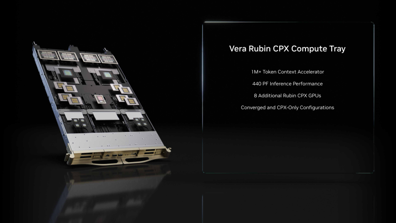 NVIDIA представила соускоритель Rubin CPX со 128 Гбайт GDDR7 для масштабных задач ИИ-инференсаNVIDIA неожиданно анонсировала чип Rubin CPX — GPU нового класса, спроектированный для масштабных задач ИИ-инференса и работы с моделями, использующими длинный контекст. Поставки решения планируется организовать в конце 2026 года. Чип Rubin CPX выполнен в виде монолитного кристалла и оснащён 128 Гбайт памяти GDDR7. Заявленная ИИ-производительность достигает 30 Пфлопс в режиме NVFP4. Предусмотрены по четыре блока NVENC и NVDEC для кодирования и декодирования видеоматериалов. Новинка дополнит другие ускорители компании. Оркестрацией нагрузок будет заниматься платформа NVIDIA Dynamo, распределяющая нагрузки между подходящими для каждой задачи ускорителями. Изделие Rubin CPX предназначено для использования вместе с Arm-процессорами Vera и ускорителями Rubin в составе новой стоечной платформы NVIDIA Vera Rubin NVL144 CPX. Эта система будет объединять 144 чипа Rubin CPX, 144 чипа Rubin и 36 процессоров Vera (88 кастомных 3-нм Arm-ядер). Говорится об использовании суммарно 100 Тбайт памяти с агрегированной пропускной способностью 1,7 Пбайт/с. Общая производительность на операциях NVFP4 — до 8 Эфлопс, что примерно в 7,5 раза больше по сравнению с системами NVIDIA GB300 NVL72. Задействована система жидкостного охлаждения. Кроме того, NVIDIA планирует выпуск двухстоечного решения, включающего стойку Vera Rubin NVL144 CPX и «обычную» стойку Vera Rubin NVL144. «Платформа Vera Rubin ознаменует собой новый скачок производительности в области вычислений ИИ, предлагая как GPU следующего поколения Rubin, так и чип нового класса CPX. Это первый CUDA GPU, специально разработанный для ИИ с длинным контекстом, когда модели одновременно обрабатывают миллионы токенов», — отмечает Дженсен Хуанг (Jensen Huang), основатель и генеральный директор NVIDIA. Основная задача Rubin CPX — работа с контекстом в больших моделях и создание KV-кеша. Эта операция ограничена вычислительными способностями чипа, тогда как генерация токенов зависит уже от пропускной способности памяти и интерконнекта для быстрого обмена данными. NVIDIA предложила разделить эти этапы и на аппаратном уровне. CPX лишён HBM, зато операции возведения в степень он делает втрое быстрее, чем Blackwell Ultra. |