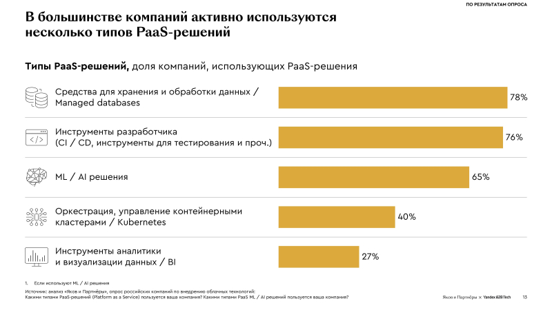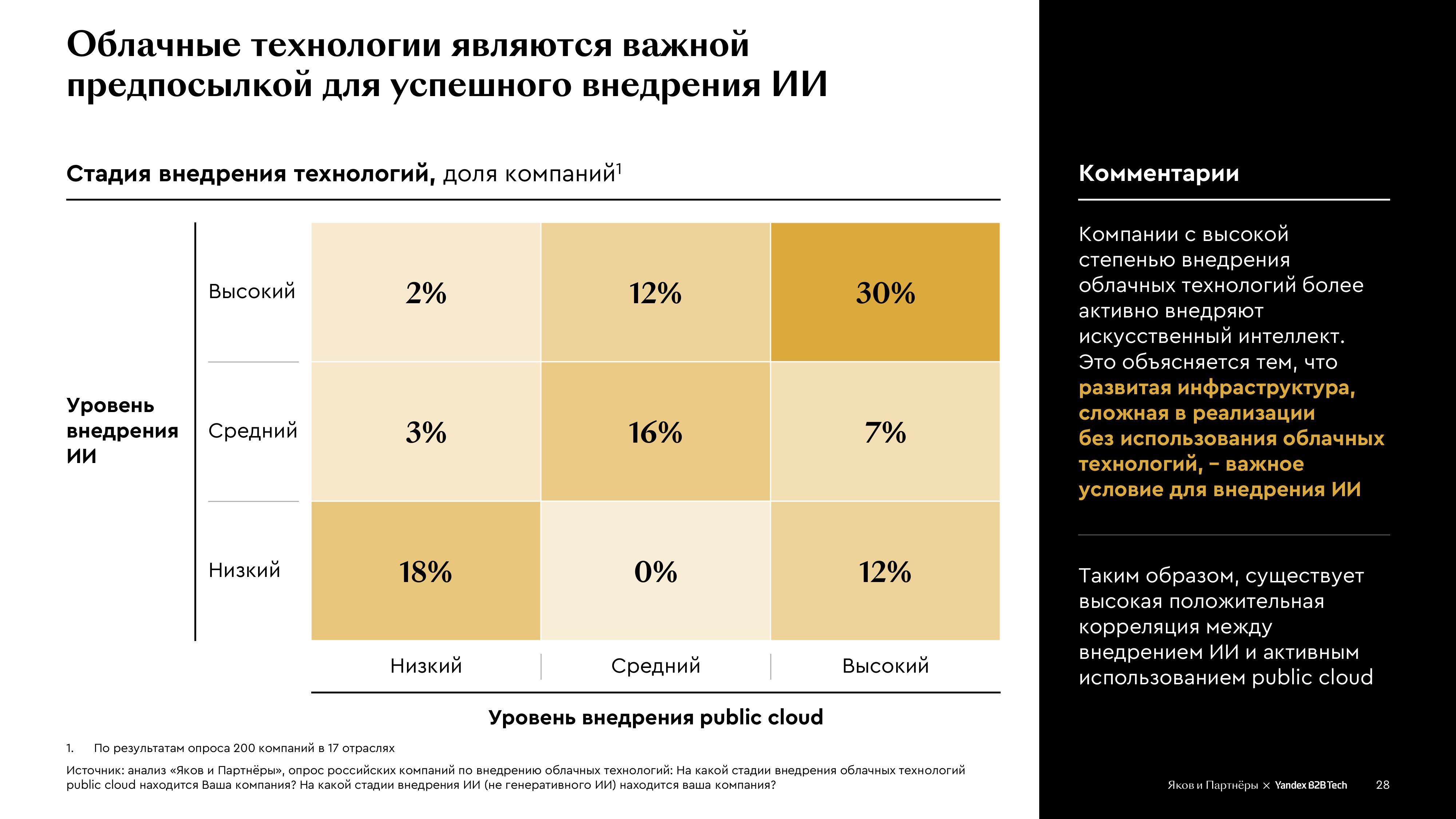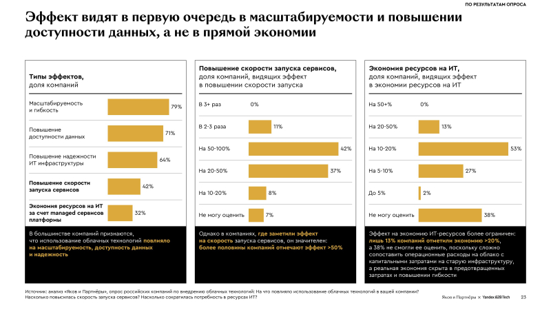 Внедрение облачных технологий увеличивает прибыль компаний, показало исследование Yandex B2B Tech и «Яков и Партнёры»Согласно совместному исследованию консалтинговой компании «Яков и Партнёры» и Yandex B2B Tech «Облачные технологии: тренды и перспективы развития», российские компании продолжают наращивать масштабы использования облачных сервисов, получая от внедрения облачных решений заметный финансовый эффект. В основу исследования легли результаты опроса руководителей 200 крупных российских компаний из 17 отраслей. По оценкам экспертов, большей частью высоким уровнем внедрения ИИ могут похвастать компании с высоким уровнем использования облаков — таких 30 %. При низком уровне использования облаков уровень внедрения ИИ составляет не более 2 %. Около половины компаний оценивают эффект от внедрения облачных решений как превышающий 3 % их EBITDA, что значительно больше затрат на облако. В цифровых отраслях финансовый эффект ещё выше: более 5 % EBITDA у компаний в сфере ИТ и технологий электронной коммерции, а также телекоме и медиа. У 73 % респондентов эффект превысил затраты, у 2 % — он оказался выше 25 %, но 23 % опрошенных всё ещё не могут его оценить. При этом главный результат внедрения компании видят не в прямой экономии, а в улучшение масштабируемости, повышении доступности данных и надёжности инфраструктуры. В этих условиях около половины компаний тратят на облачные решения более 5 % от годового ИТ-бюджета, а свыше 30 % планируют увеличить расходы в будущем. Большинство участников опроса (94 %) планируют и дальше использовать облачные технологии, причем 44 % намерены масштабировать существующие решения, 28 % — применять технологии в новых сценариях, 26 % — использовать облачные технологии в тех же объёмах. Половина компаний планирует увеличить количество провайдеров облачных услуг. При этом ключевым критерием при выборе компании называют качество платформы и сопутствующих сервисов, превышающим по значимости цену и модель ценообразования. Согласно опросу, компании быстро переходят к гибридной модели: более 70 % используют одновременно публичное облако и on-premise инфраструктуру. Проникновение решений PaaS и SaaS составляет 65–66 %, при этом свыше половины компаний (52 %) комбинируют IaaS-, PaaS- и SaaS. Компании активно используют PaaS для ускорения разработки, анализа данных и внедрения AI-технологий, в большинстве случаев — несколько типов. Наиболее востребованы решения для хранения и обработки данных (78 % респондентов), инструменты для разработчиков (76 %), сервисы в области ML и ИИ (65 %), оркестрация, управление контейнерными кластерами (40 %) и инструменты аналитики и визуализации данных (27 %). Отмечено, что аналитические платформы ускоряют подготовку отчётов более чем в два раза, автоматизация консультаций снижает нагрузку на клиентскую поддержку на 20 %, а генеративные сервисы для создания карточек товаров увеличивают скорость публикации в десятки раз. В исследовании отмечено, что глобальный рынок публичных облаков увеличился с 2020 по 2024 гг. почти втрое, до почти $600 млрд, и, согласно прогнозу, достигнет $1,26 трлн в 2028 году. По словам «Яков и Партнёры», на публичные облака приходится больше 60 % мирового рынка ПО, и при позитивном сценарии к 2030 году доля может составить порядка 80 %. При этом в России этот рынок всё ещё является недостаточно зрелым, занимая около 35 % рынка ПО. Вм